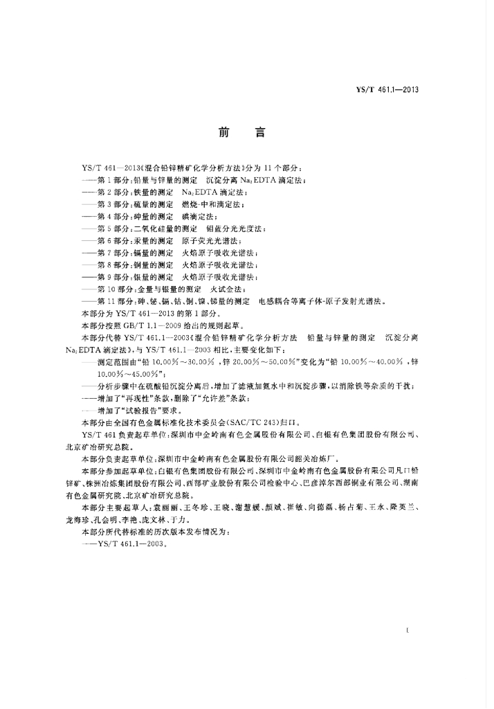 YS/T 461.1-2013 混合铅锌精矿化学分析方法 第1部分;铅量与锌量的测定沉淀分离Na2EDTA滴定法
