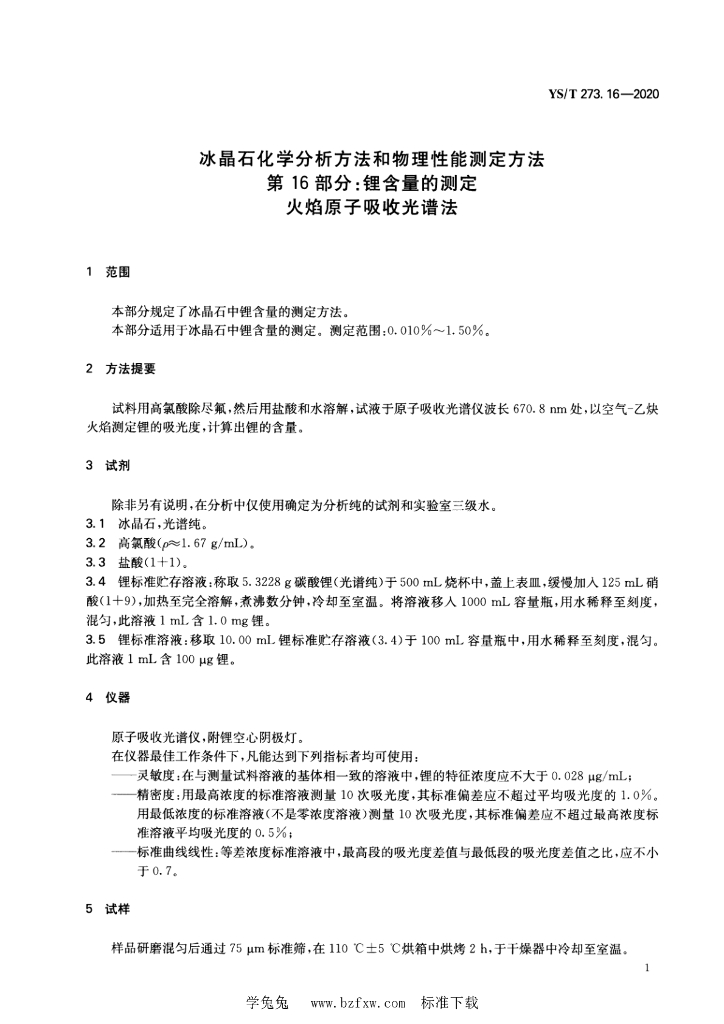 YS/T 273.16-2020 冰晶石化学分析方法和物理性能测定方法 第16部分:锂含量的测定 火焰原子吸收光谱法