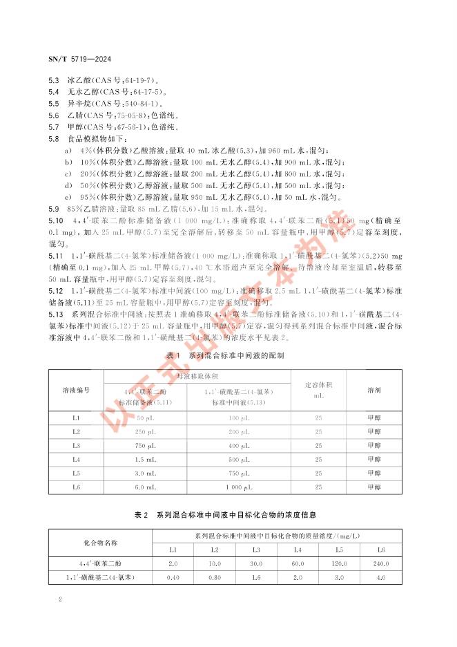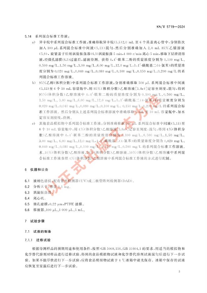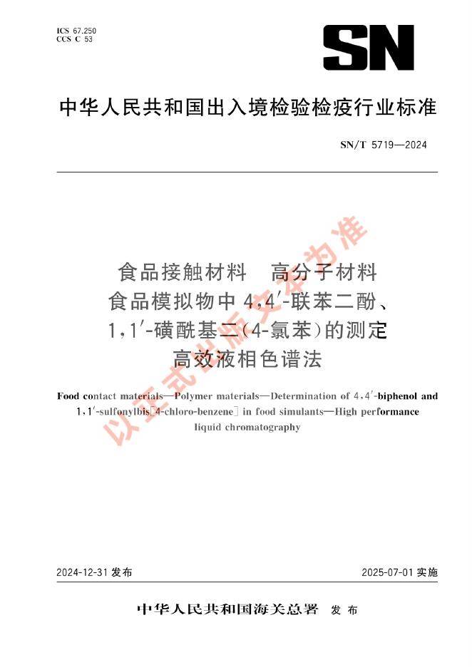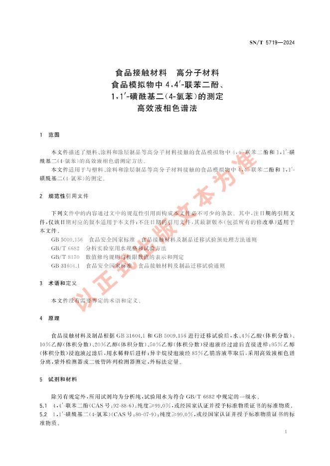 SN/T 5719-2024 食品接触材料 高分子材料 食品模拟物中4,4'-联苯二酚、1,1'-磺酰基二(4-氯苯)的测定 高效液相色谱法