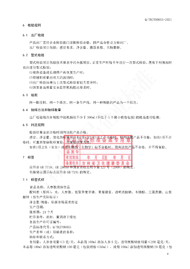 Q/THJT 0005S-2021 人参肽液体饮品
