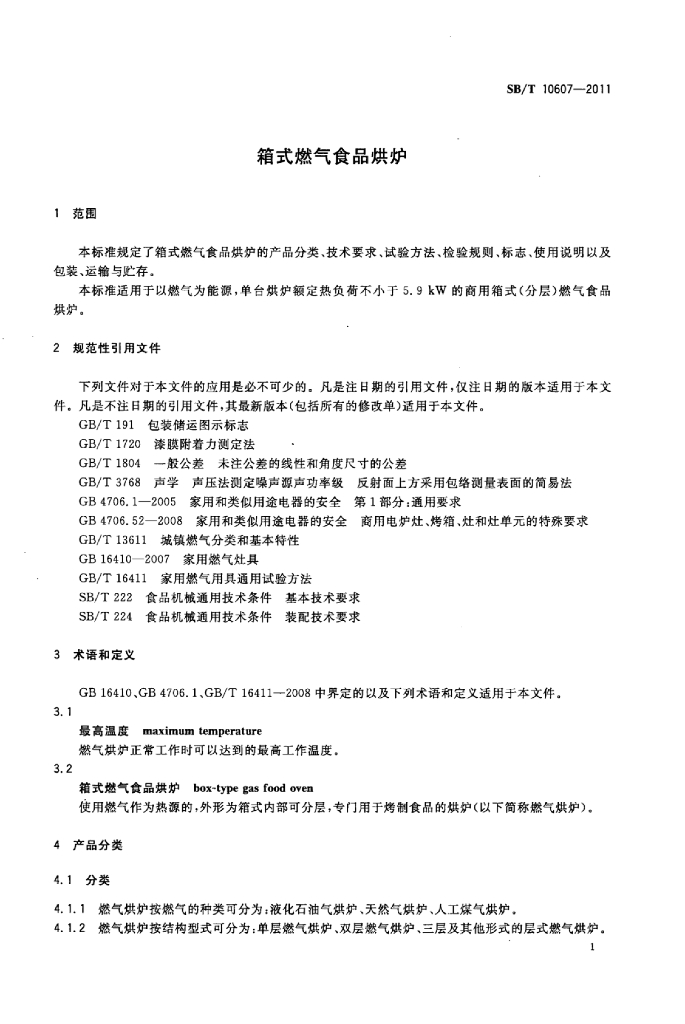 SB/T 10607-2011 箱式燃气食品烘炉