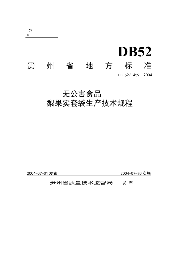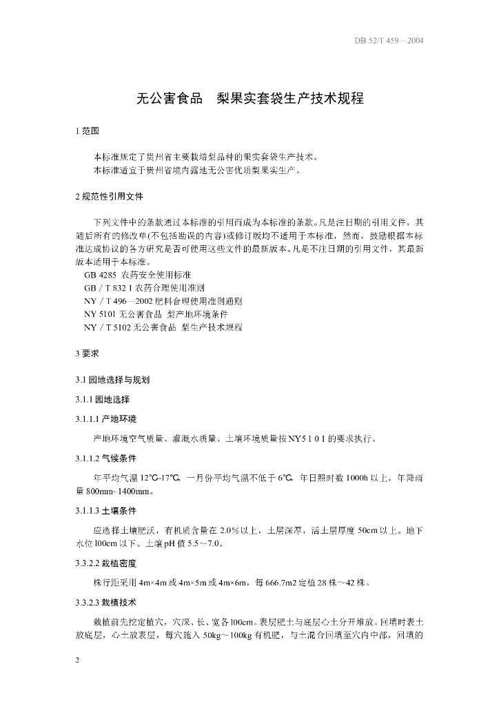 DB52/T 459-2004 无公害食品 梨果实套袋生产技术规程