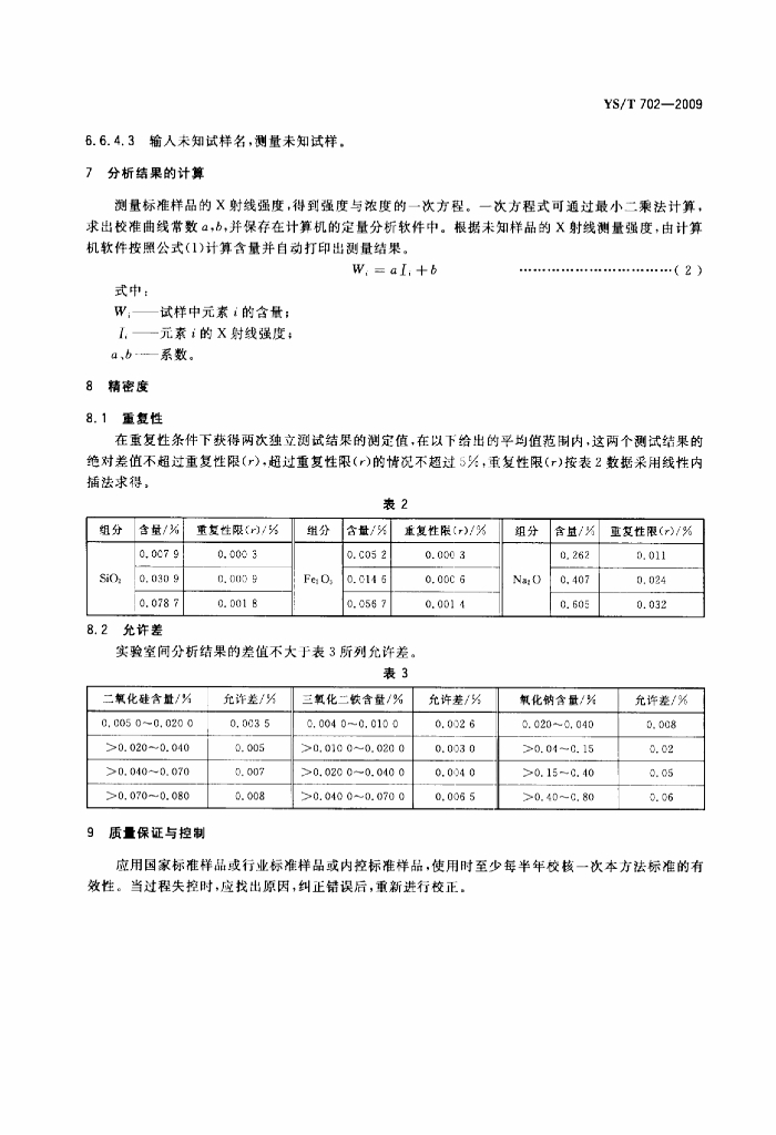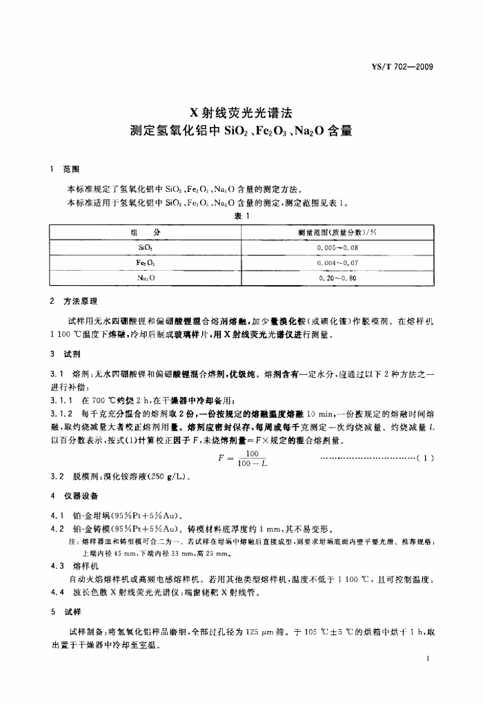 YS/T 702-2009 X射线荧光光谱法 测定氢氧化铝中SiO2、Fe2O3、Na2O含量