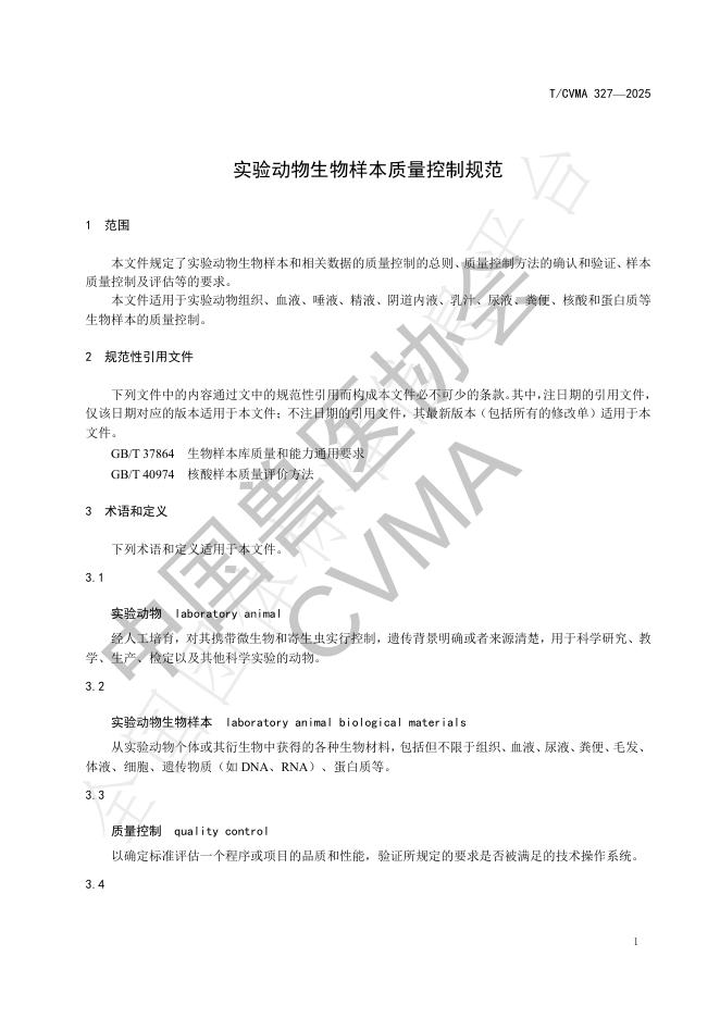 T/CVMA 327-2025 实验动物生物样本质量控制规范