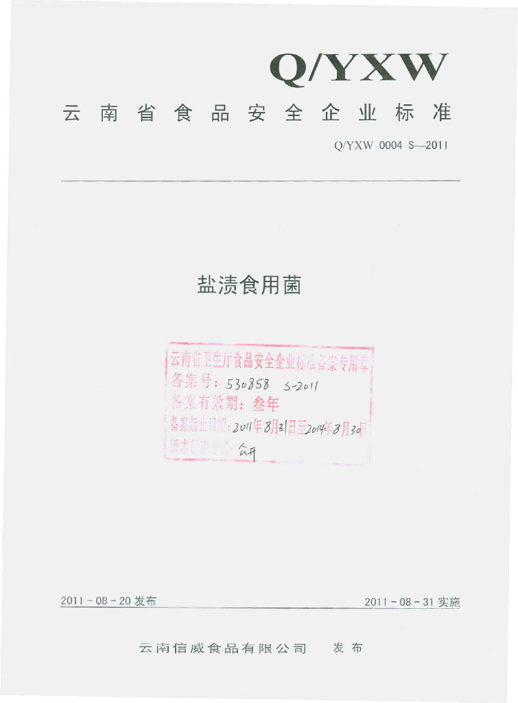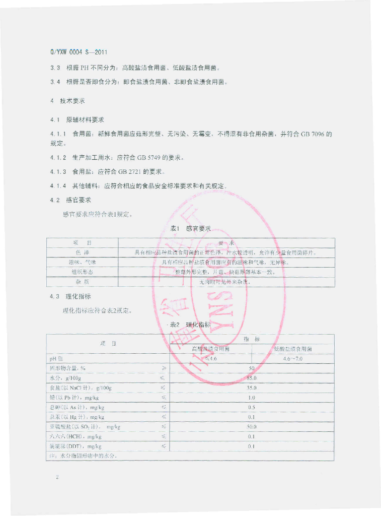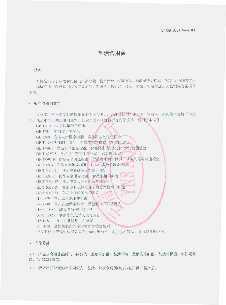 Q/YXW 0004S-2011 盐渍食用菌