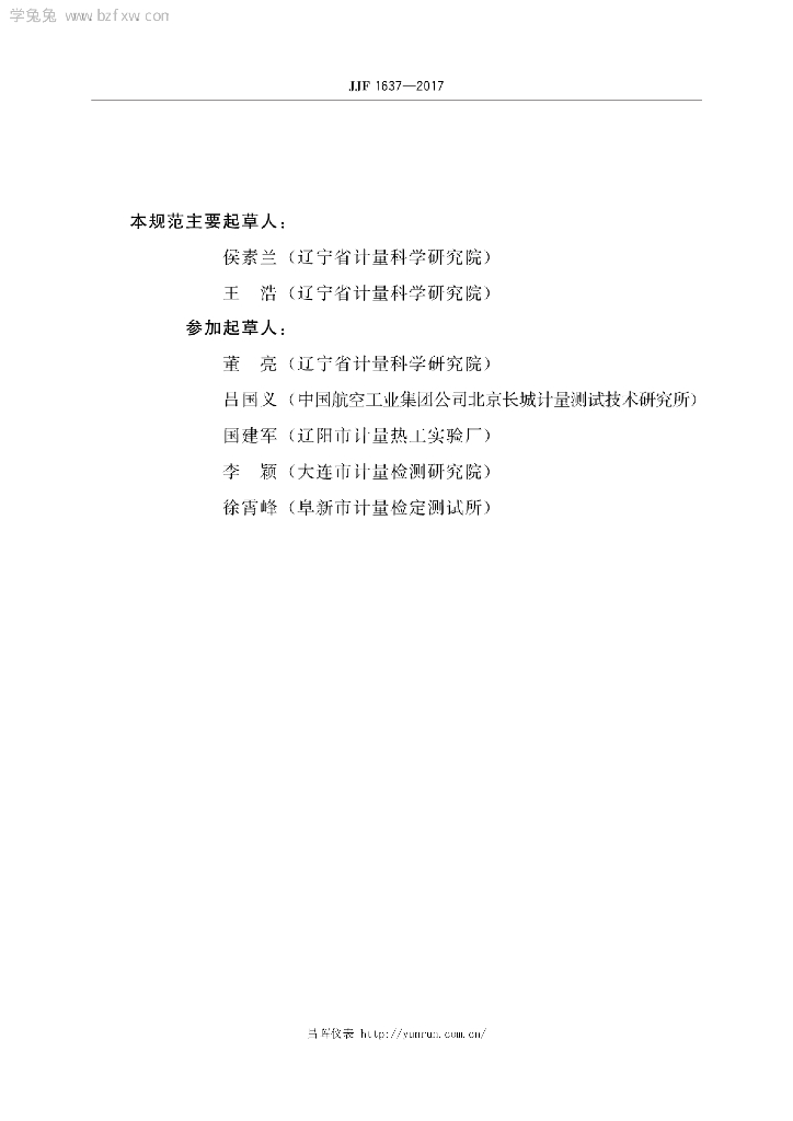 侯素兰(辽宁省计量科学研究院)、王浩(辽宁省计量科学研究院)、董亮(辽宁省计量科学研究院)、吕国义(中国航空工业集团公司北京长城计量测试技术研究所)、国建军(辽阳市计量热工实验厂)、李颖(大连市计量检测研究院)、徐霄峰(阜新市计量检定测试所)