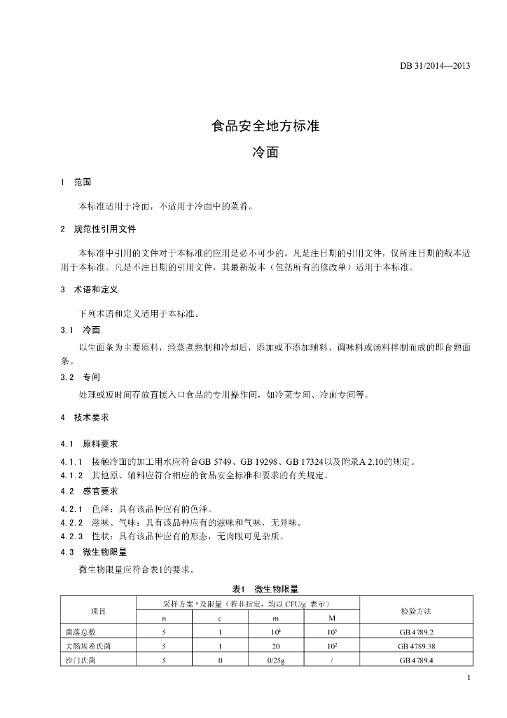 DB31/ 2014-2013 食品安全地方标准 冷面