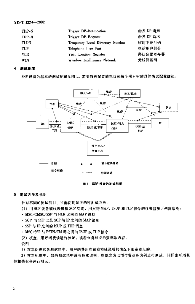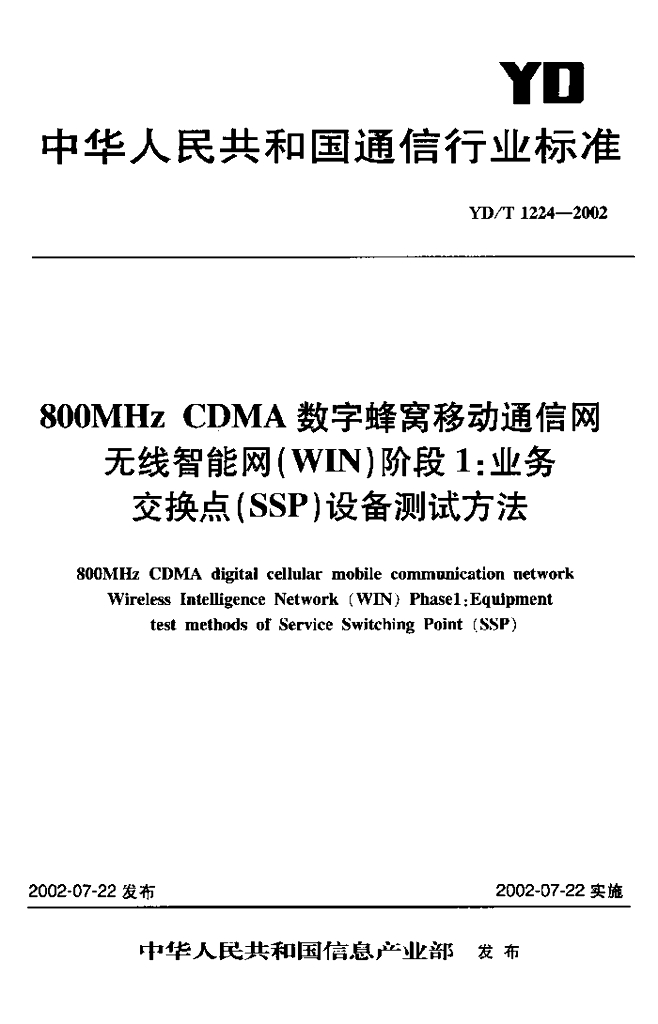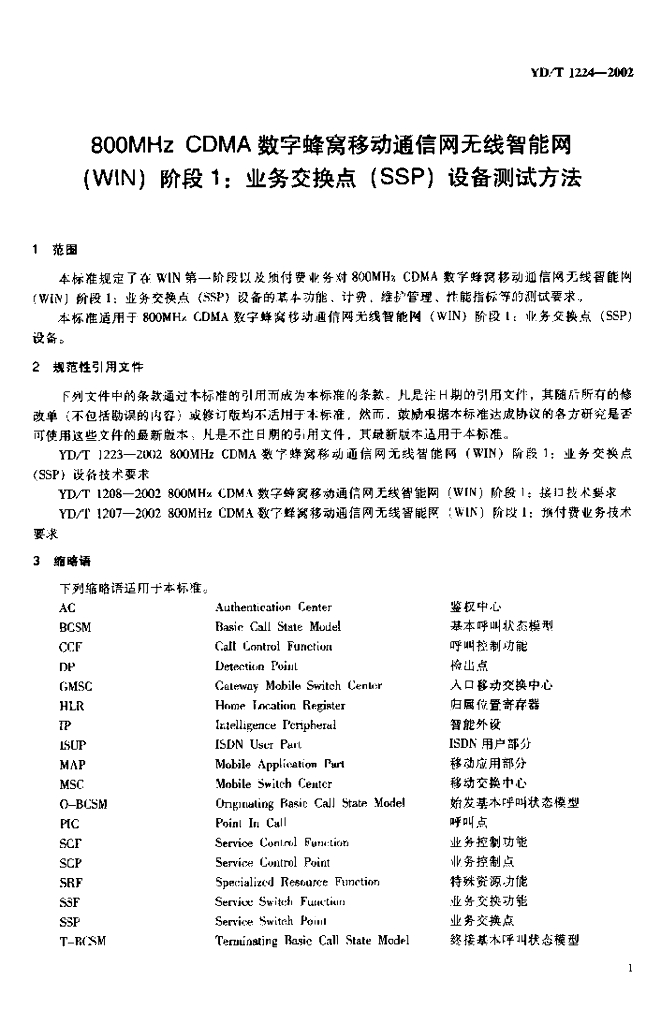 YD/T 1224-2002 800MHz CDMA 数字蜂窝移动通信网无线智能网(WIN)阶段1:业务交换点(SSP)设备测试方法