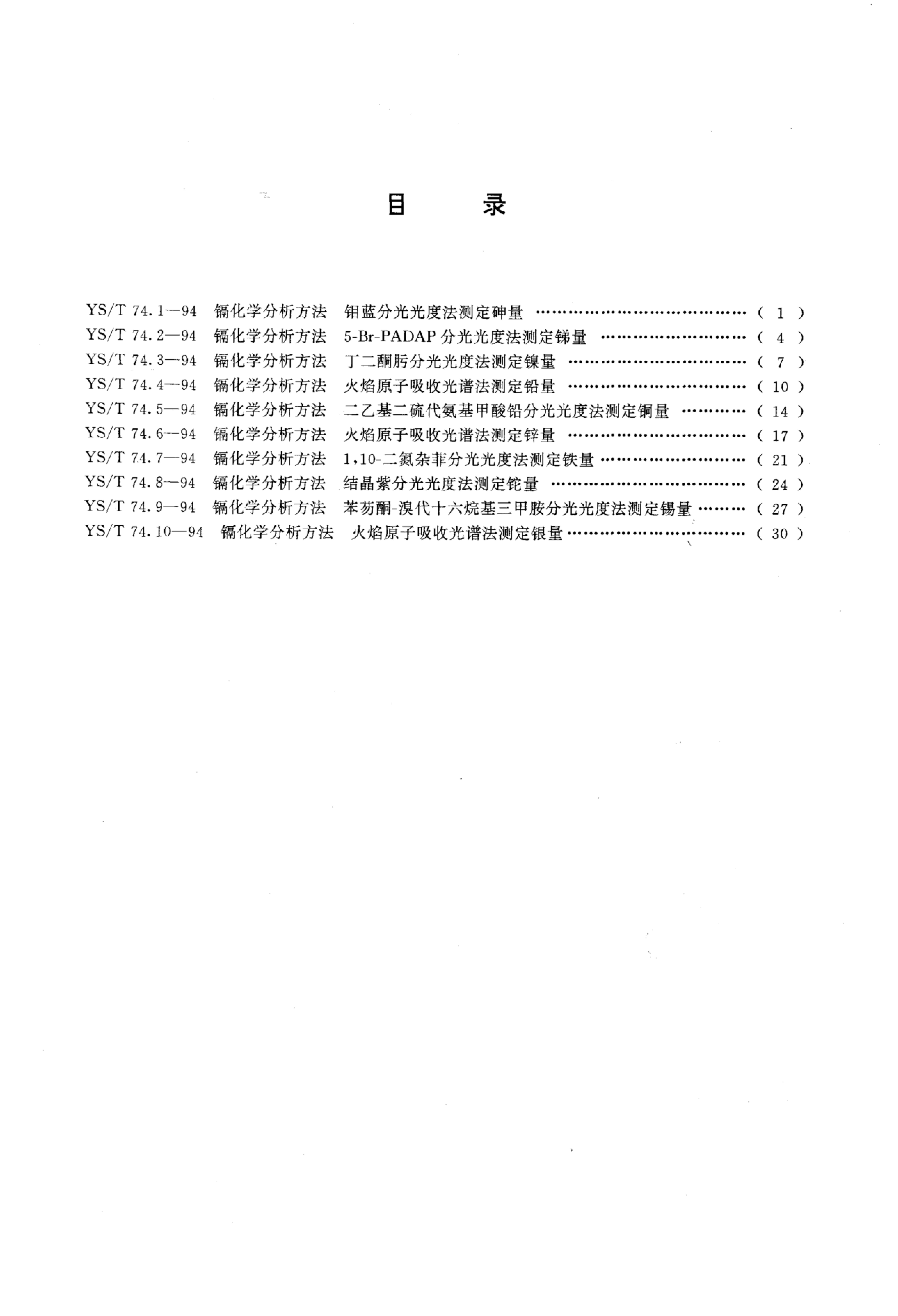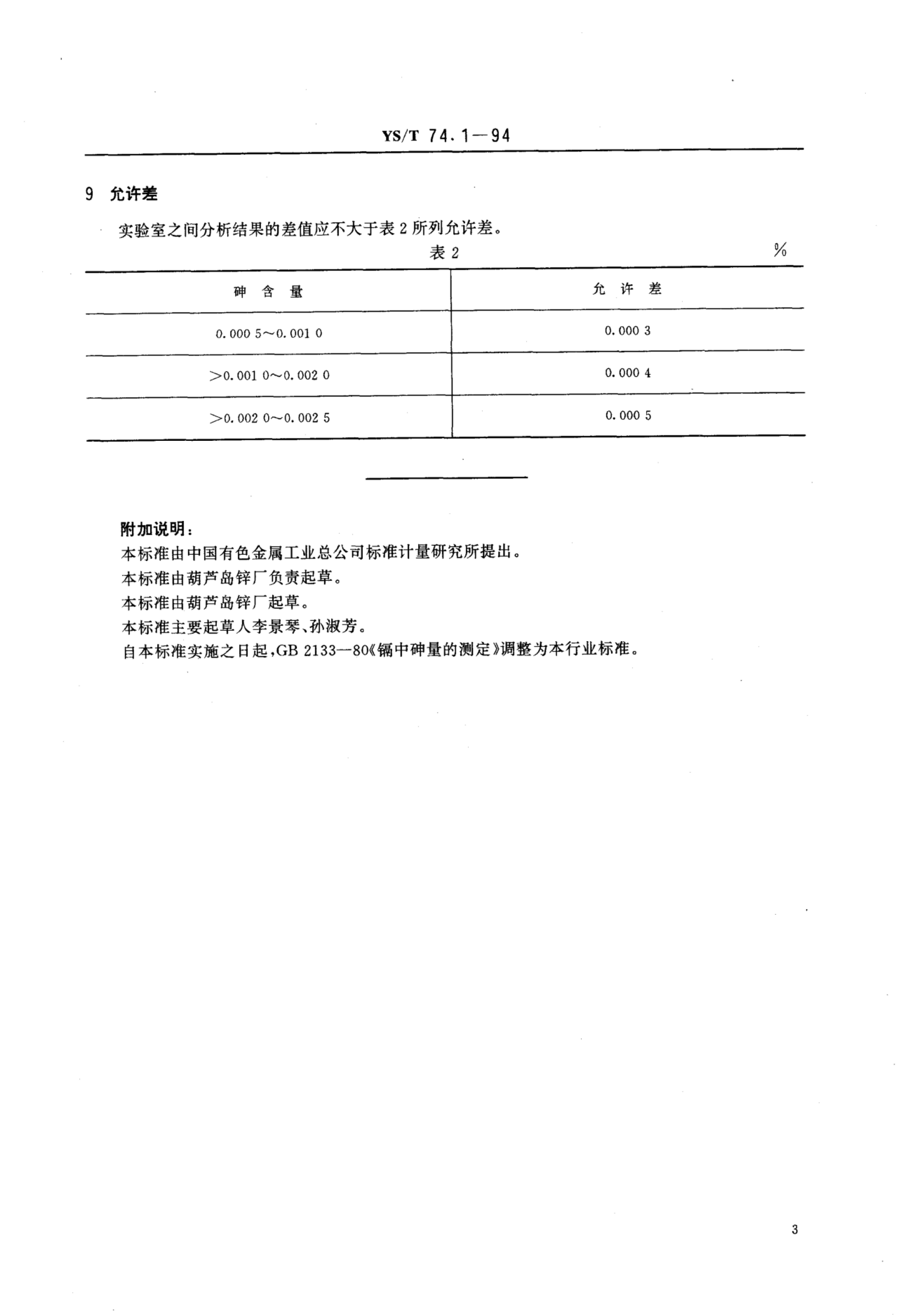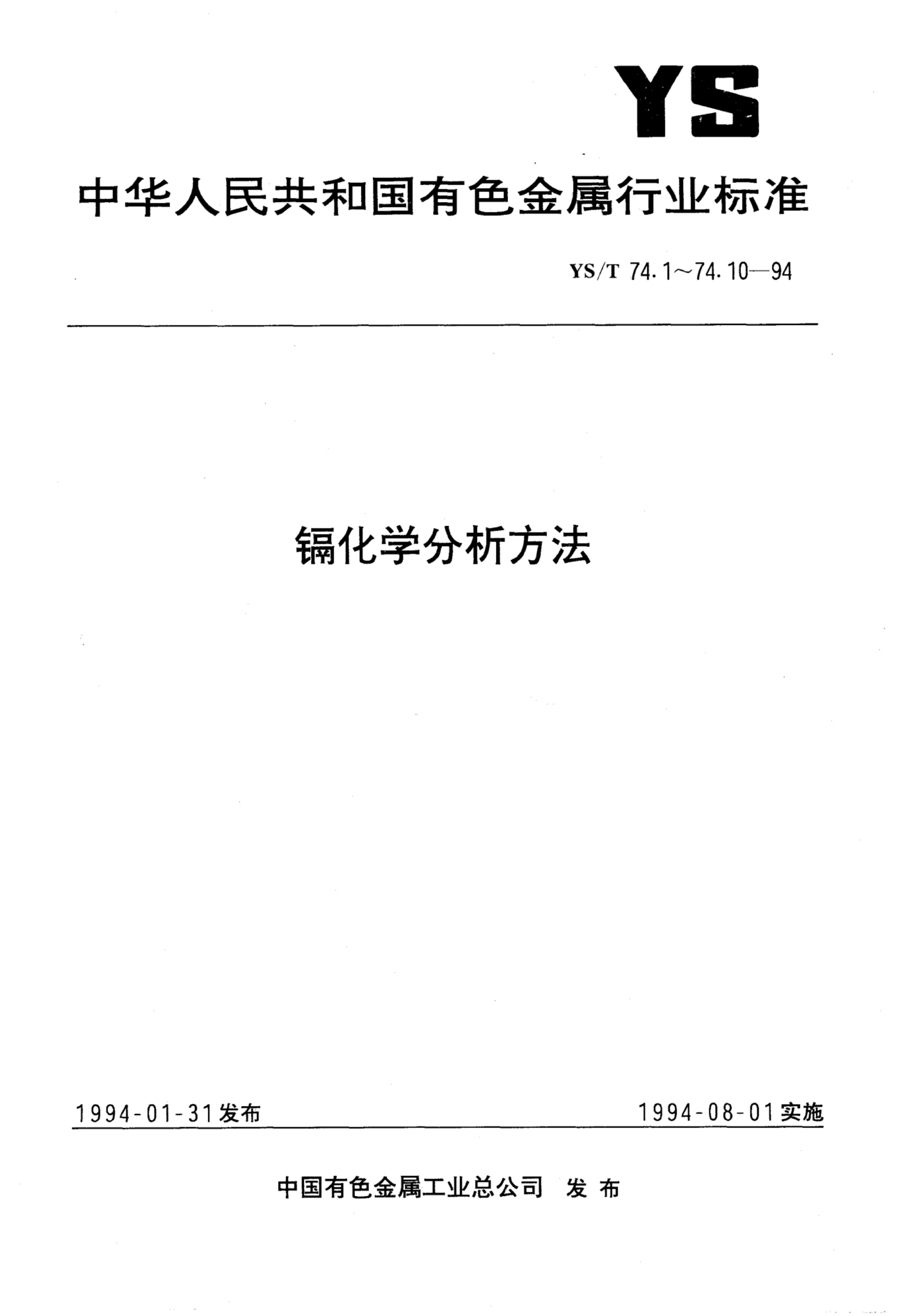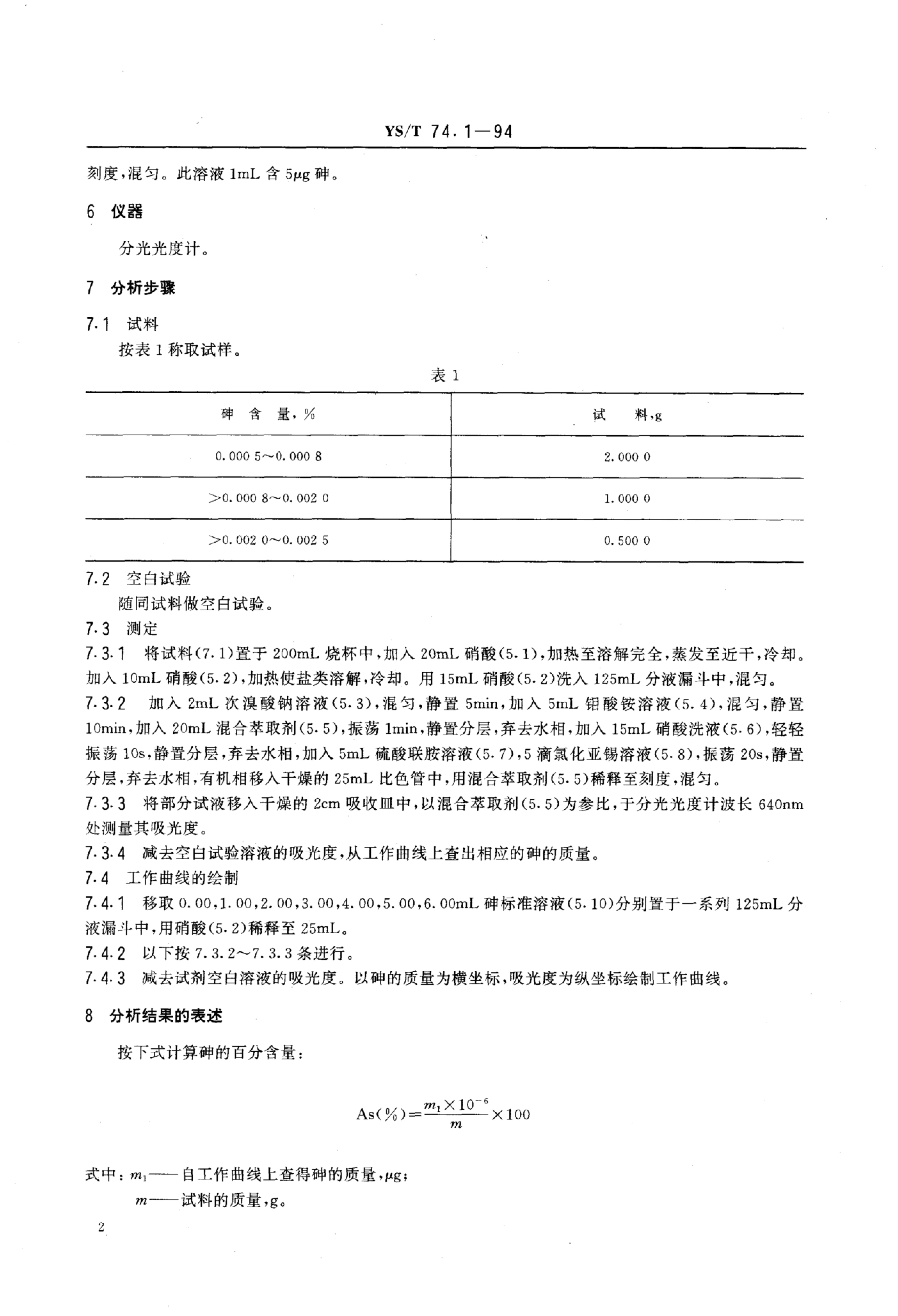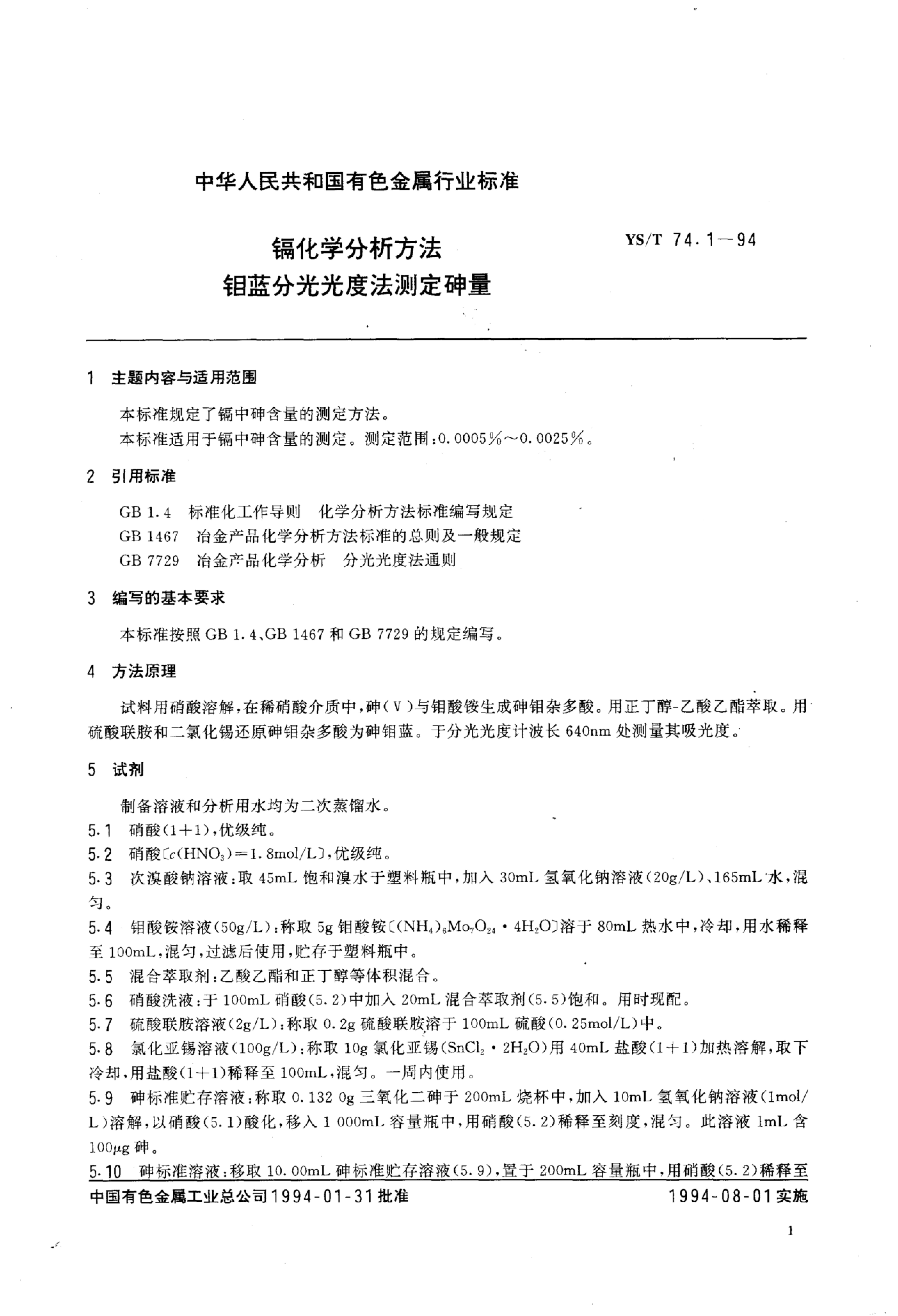 YS/T 74.1-1994 镉化学分析方法钼蓝分光光度法测定砷量