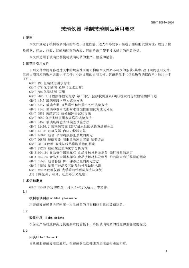 QB/T 8084-2024 玻璃仪器 模制玻璃制品通用要求