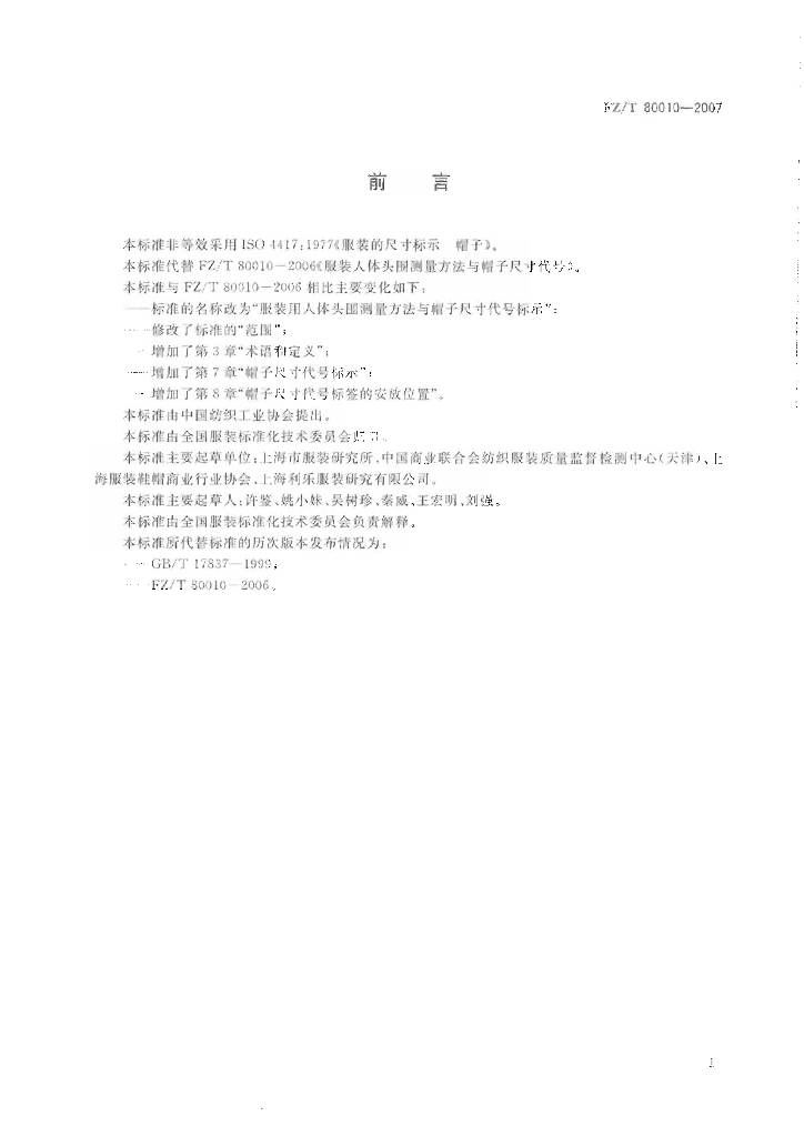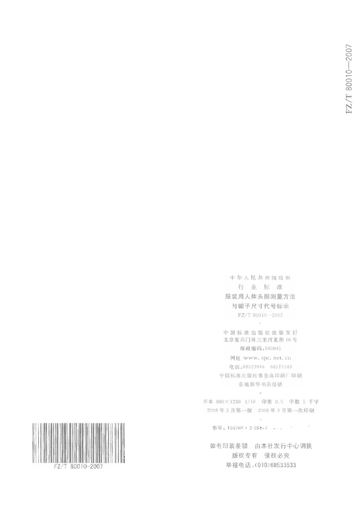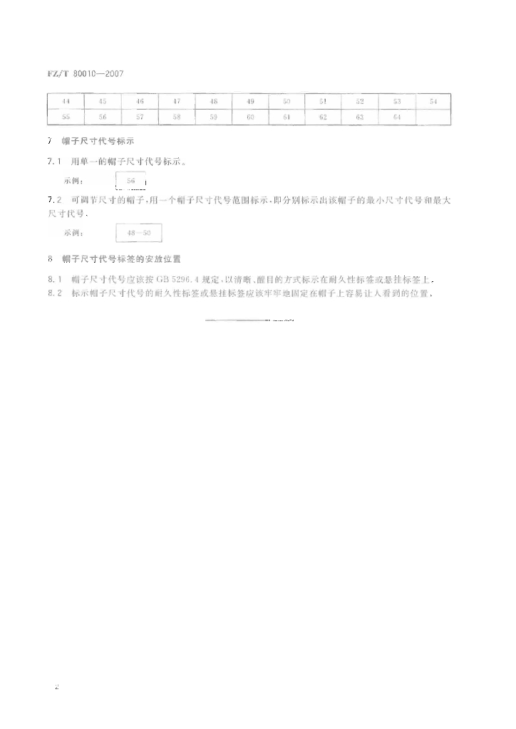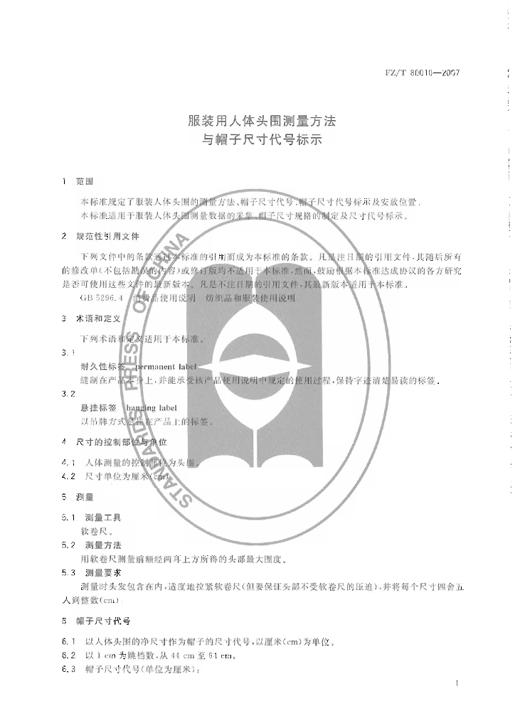 FZ/T 80010-2007 服装用人体头围测量方法与帽子尺寸代号标示