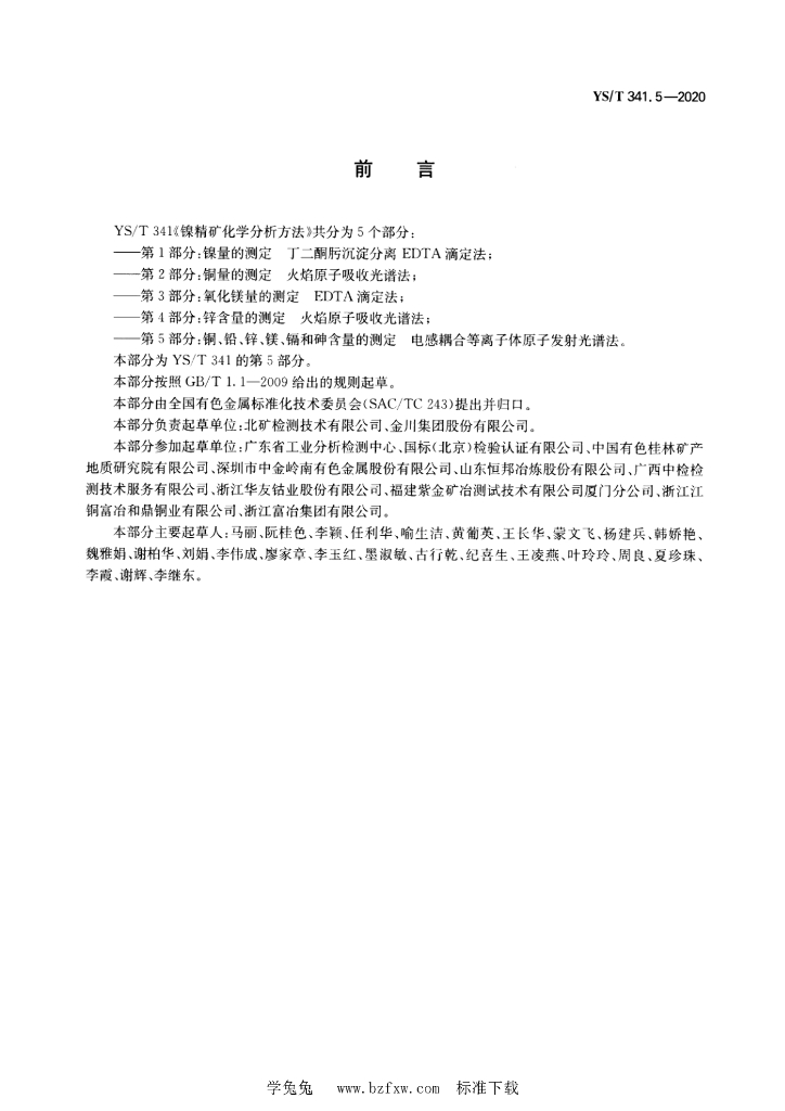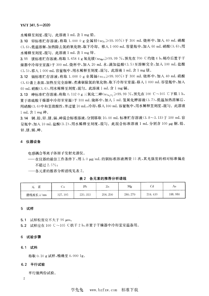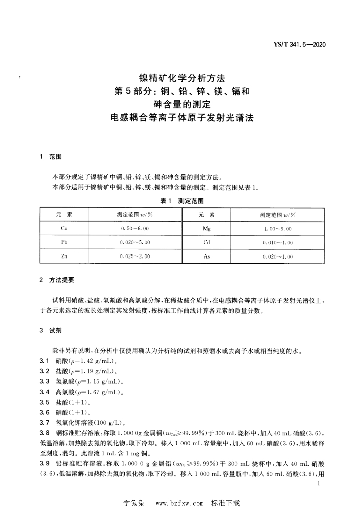 YS/T 341.5-2020 镍精矿化学分析方法 第5部分: 铜、铅、锌、镁、镉和砷含量的测定 电感耦合等离子体原子发射光谱法