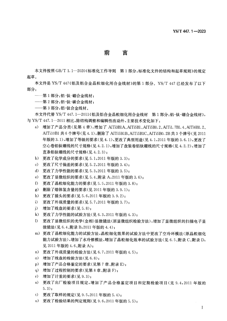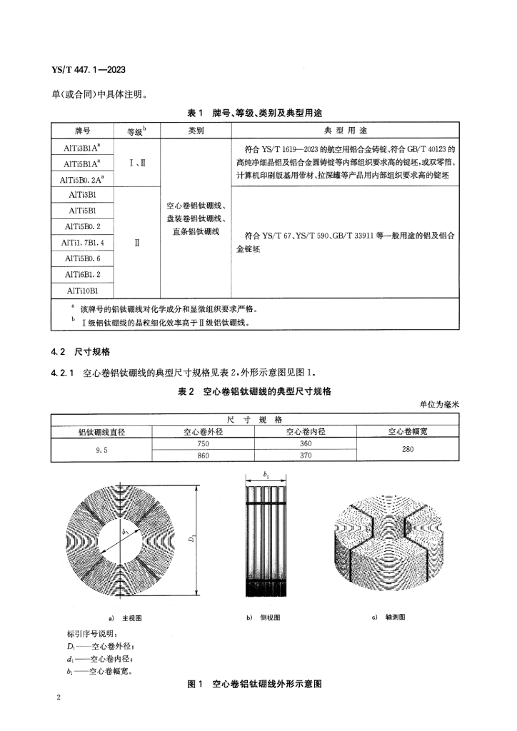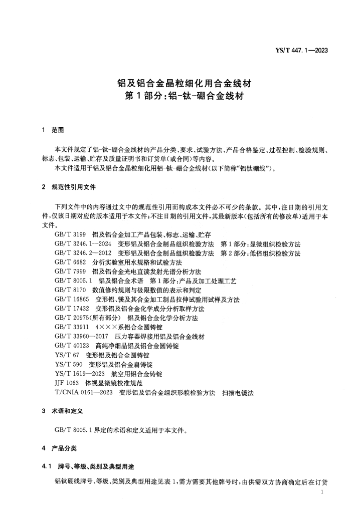 YS/T 447.1-2023 铝及铝合金晶粒细化用合金线材 第1部分:铝-钛-硼合金线材