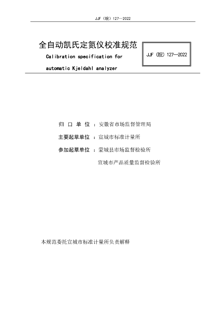 JJF(皖)127-2022 全自动凯氏定氮仪校准规范