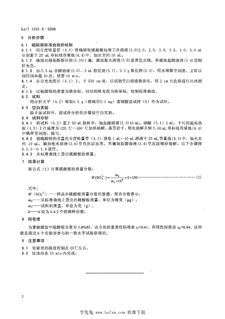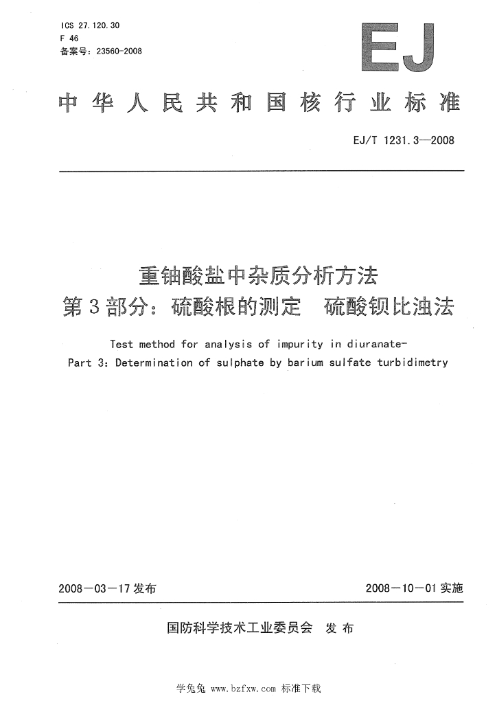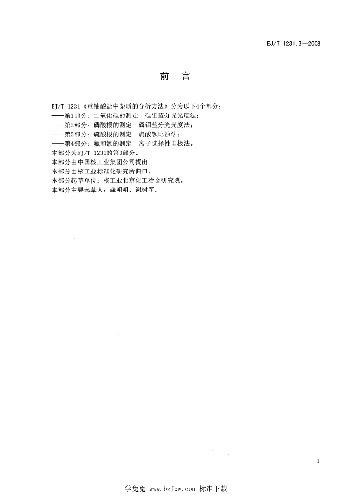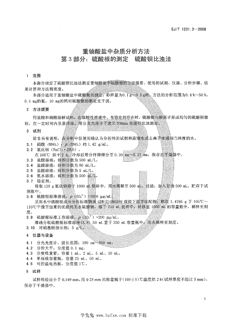 EJ/T 1231.3-2008 重铀酸盐中杂质分析方法 第3部分:硫酸根的测定硫酸钡比浊法