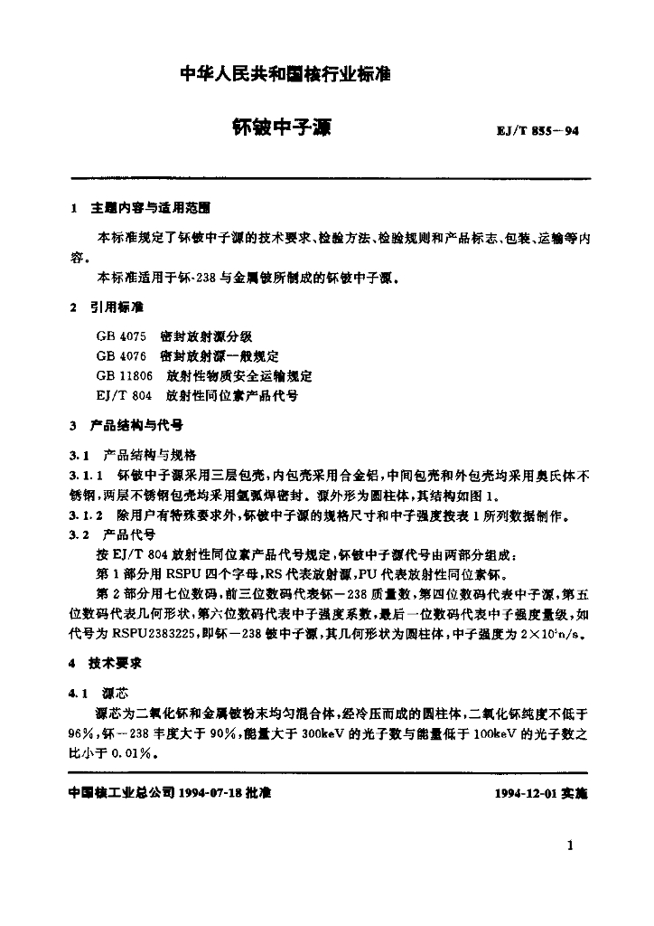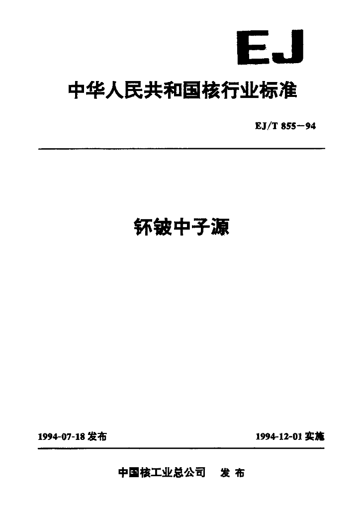 EJ/T 855-1994 钚铍中子源