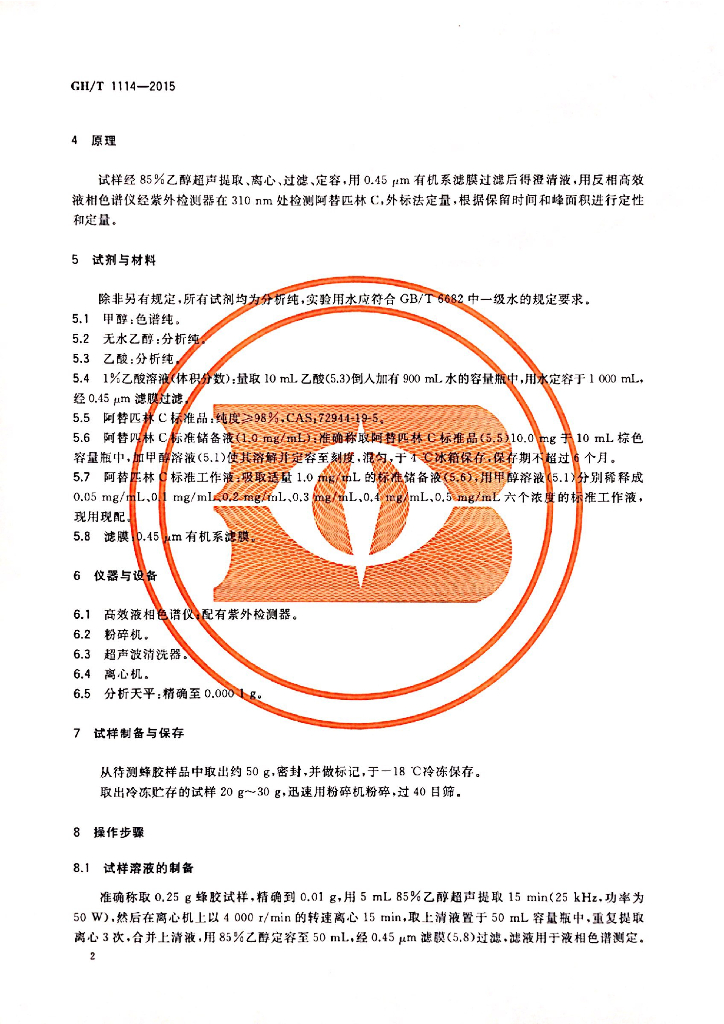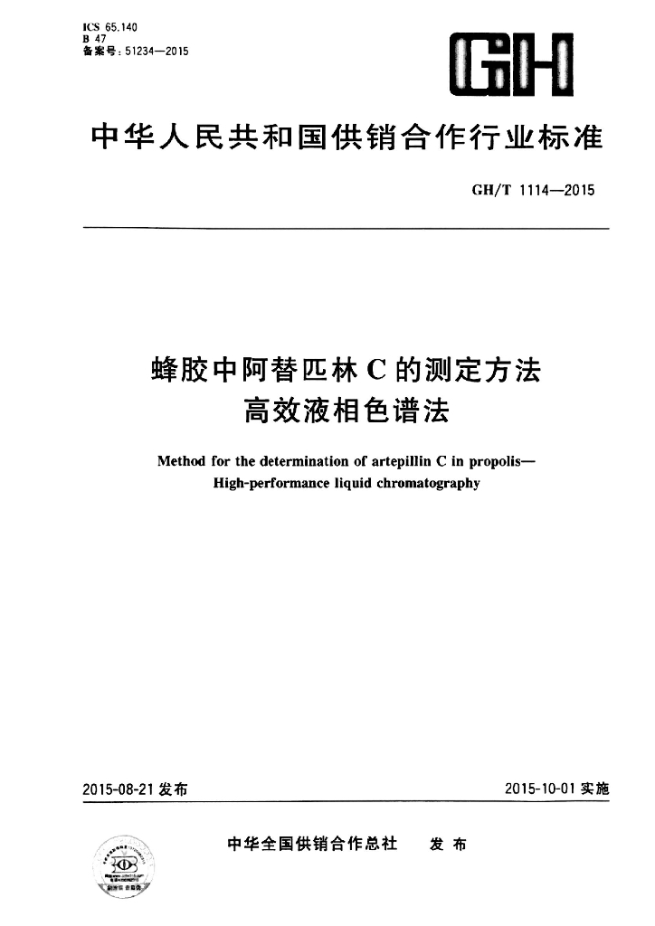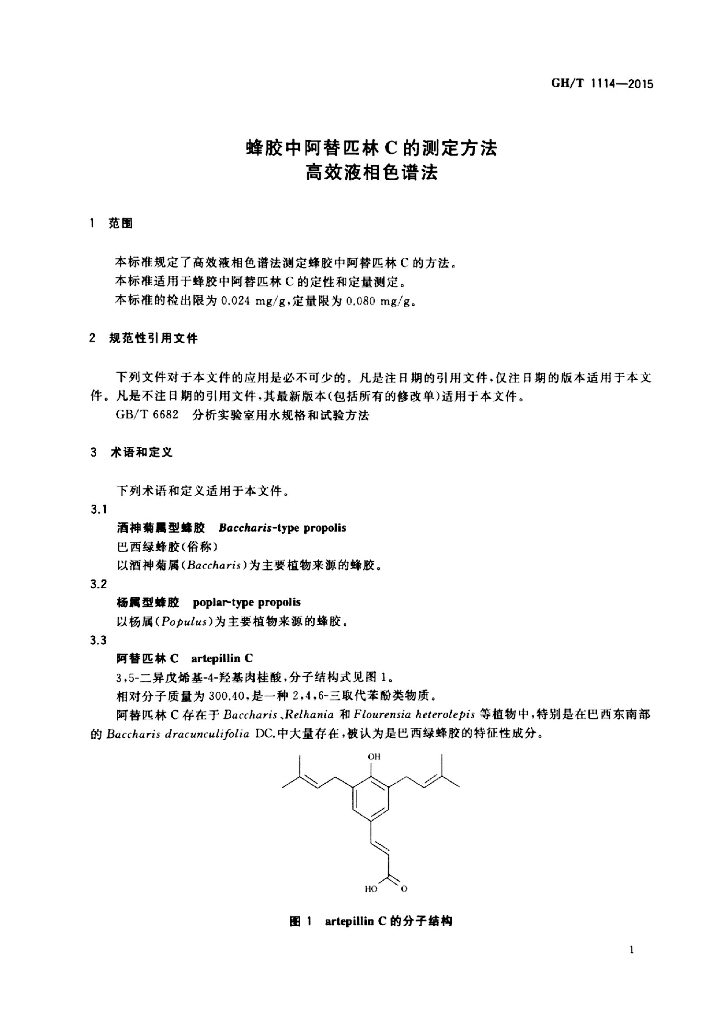 GH/T 1114-2015 蜂胶中阿替匹林C的测定方法 高效液相色谱法