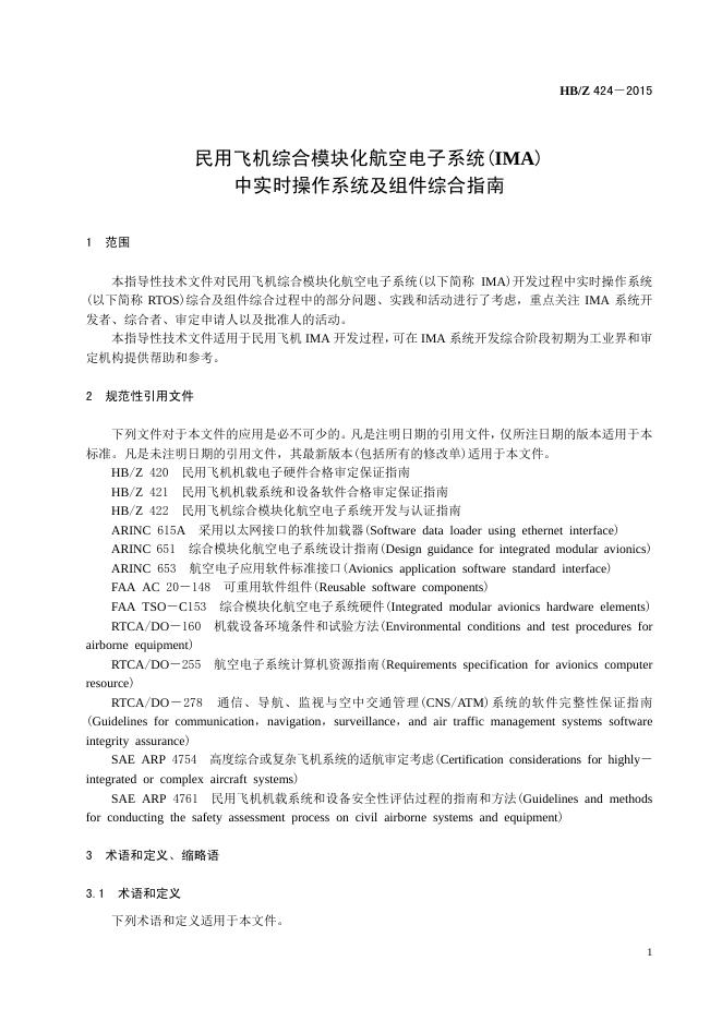 HB/Z 424-2015(2017) 民用飞机综合模块化航空电子系统(IMA)中实时操作系统及组件综合指南