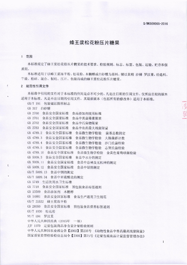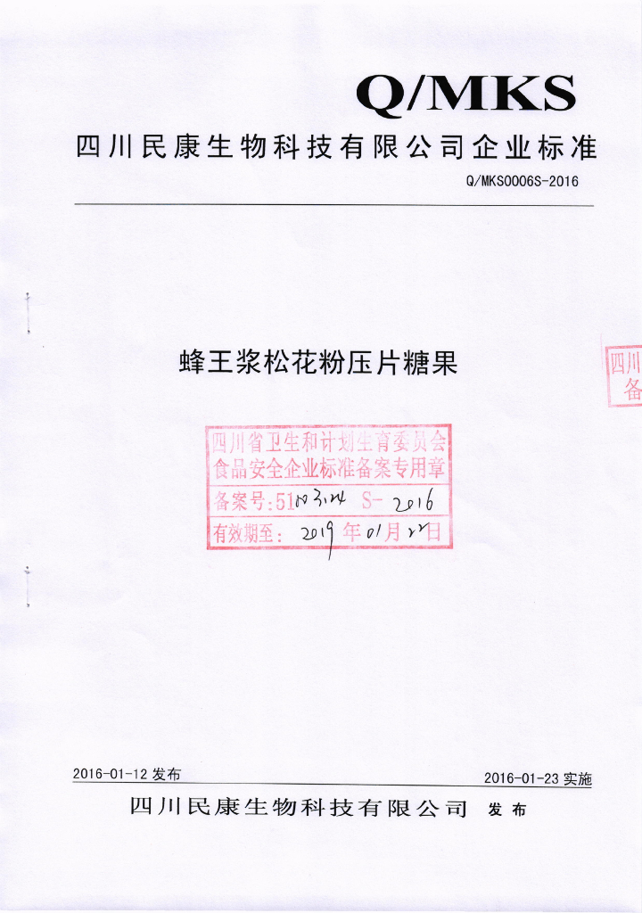 Q/MKS 0006S-2016 四川民康生物科技有限公司 蜂王浆松花粉压片糖果
