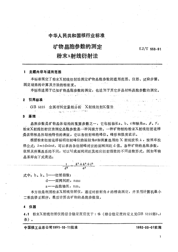 EJ/T 553-1991 矿物晶胞参数的测定粉末x射线衍射法