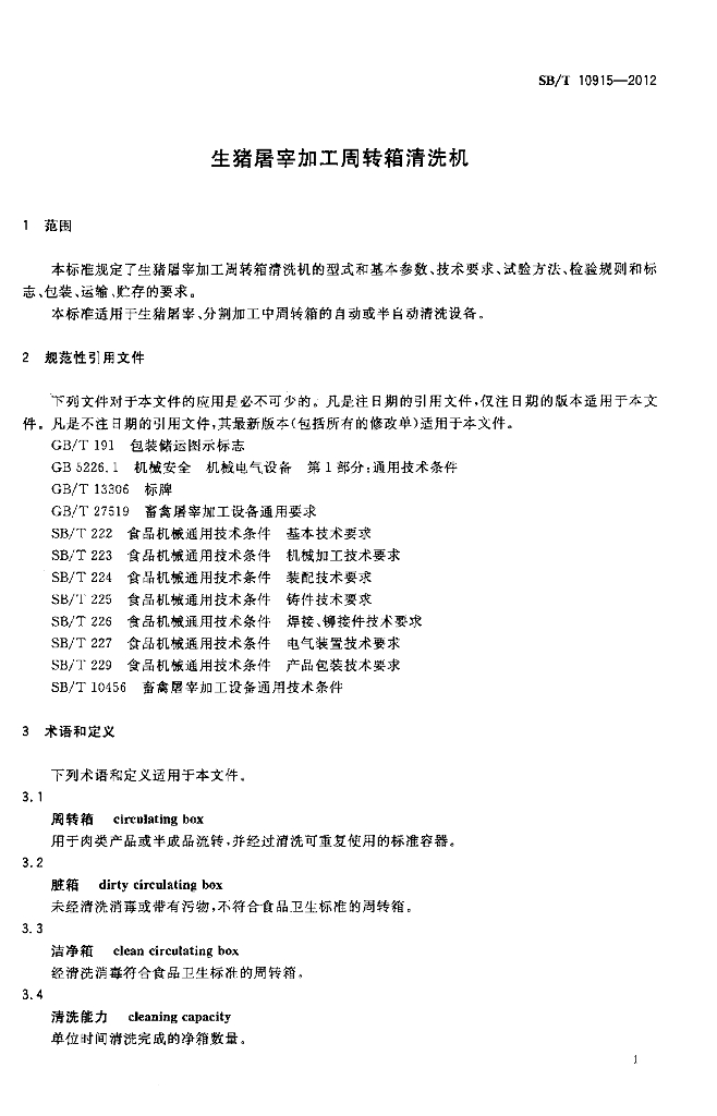 SB/T 10915-2012 生猪屠宰加工周转箱清洗机