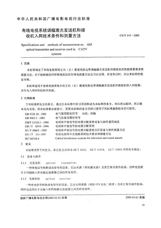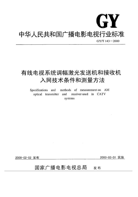 GY/T 143-1999 有线电视系统调幅激光发送机和接收机入网技术条件和测量方法