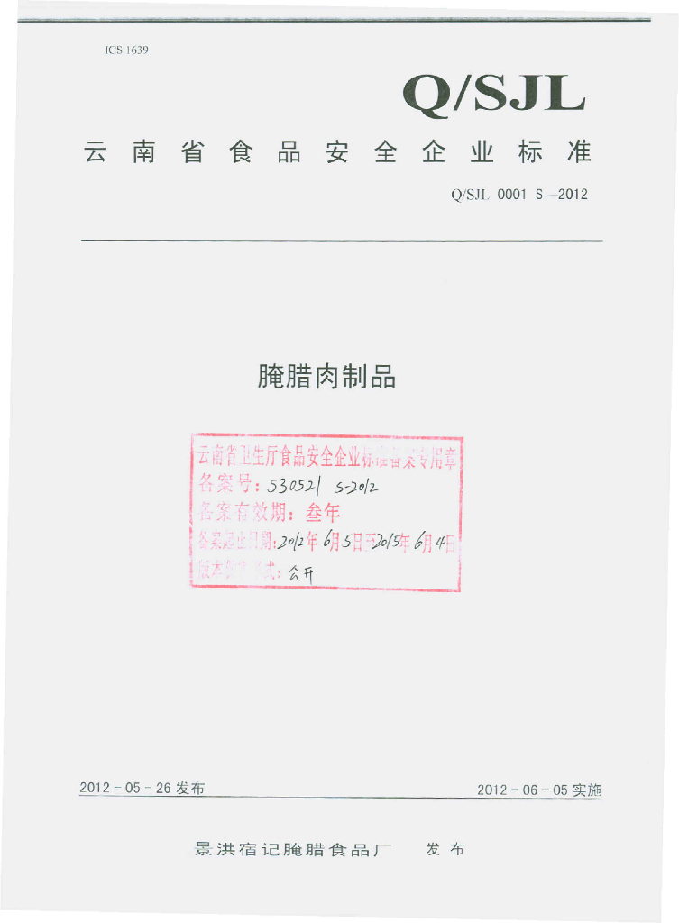 Q/SJL 0001S-2012 腌腊肉制品