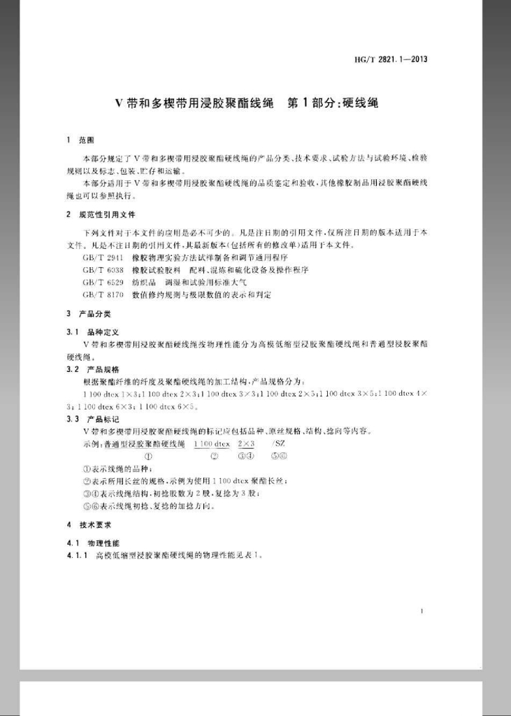 HG/T 2821.1-2013 代替 HG/T 2821-2008 V带和多楔带用浸胶聚酯线绳 第1部分:硬线绳