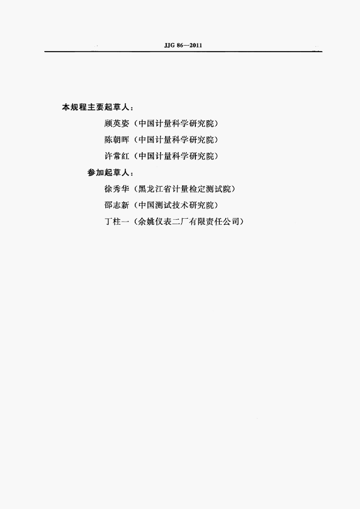 顾英姿(中国计量科学研究院)、陈朝晖(中国计量科学研究院)、许常红(中国计量科学研究院)、徐秀华(黑龙江省计量检定测试院)、邵志新(中国测试技术研究院)、丁柱一(余姚仪表二厂有限责任公司)