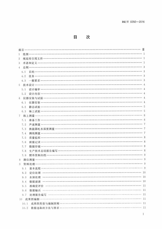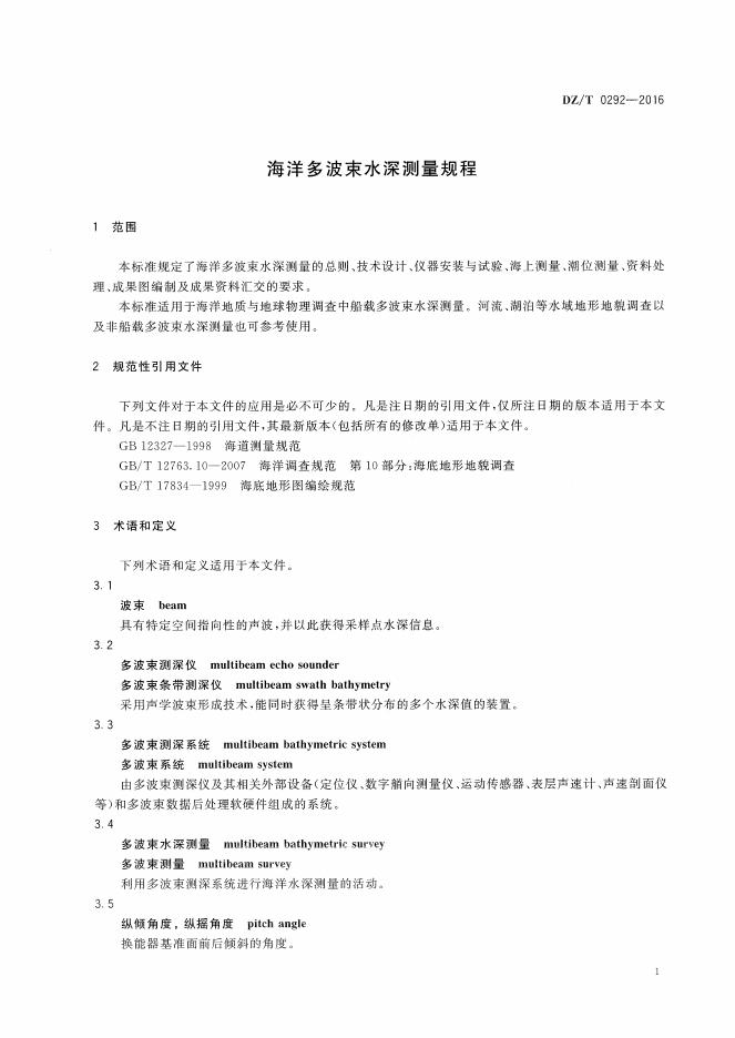 DZ/T 0292-2015 海洋多波束水深测量规程
