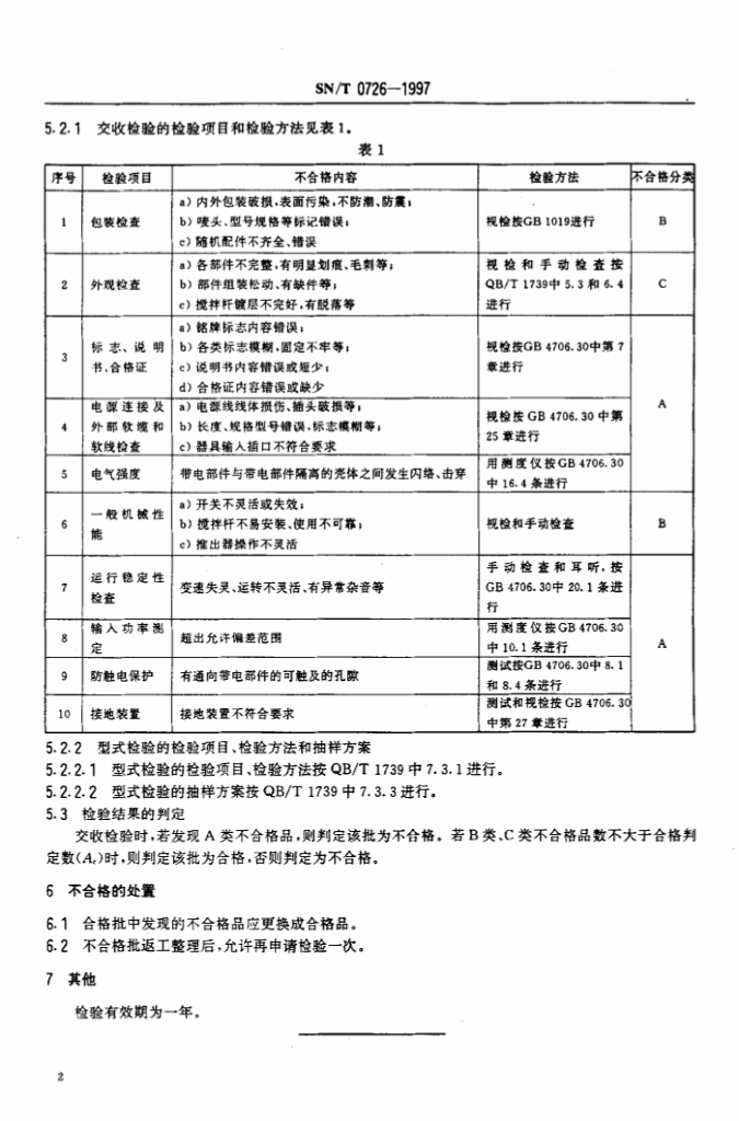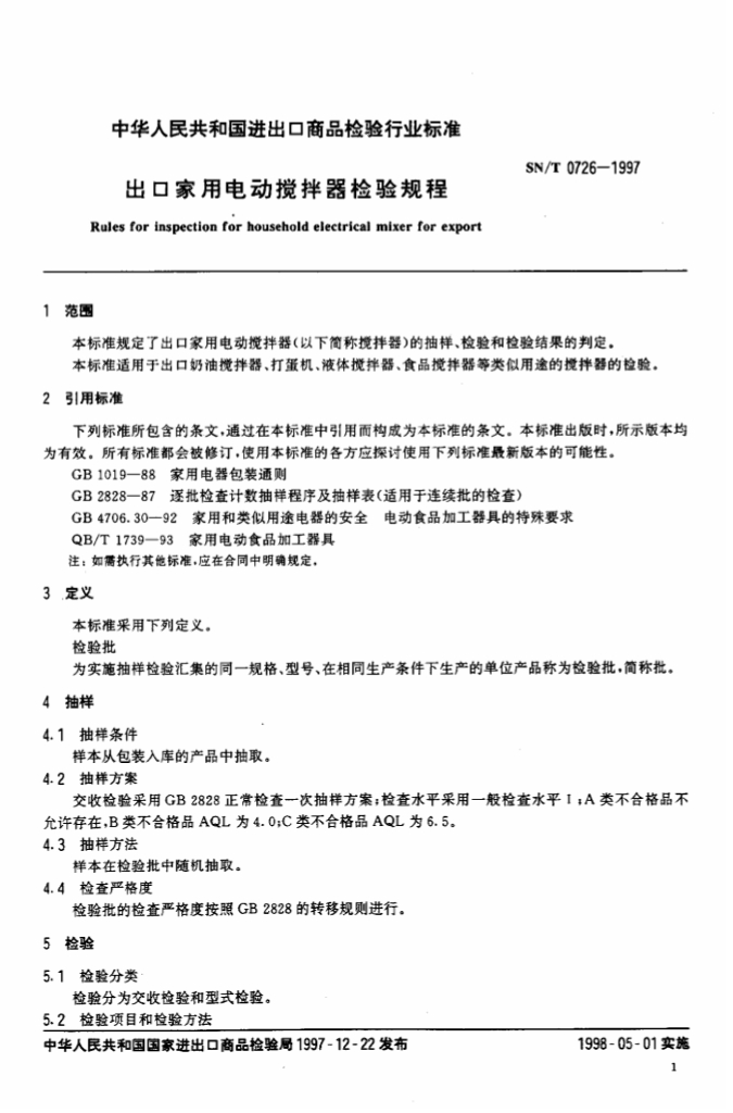 SN/T 0726-1997 出口家用电动搅拌器检验规程
