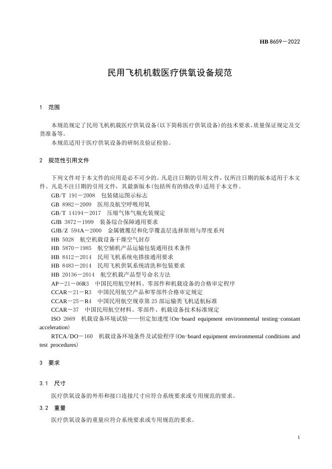 HB 8659-2022 民用飞机机载医疗供氧设备规范