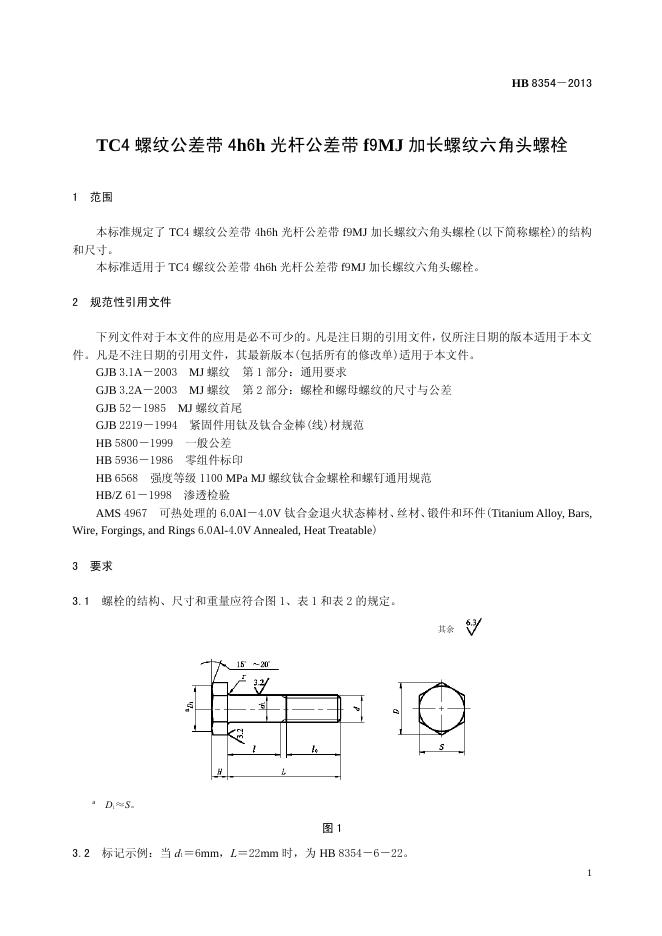 HB 8354-2013(2017) TC4螺纹公差带4H6H光杆公差带F9MJ加长螺纹六角头螺栓