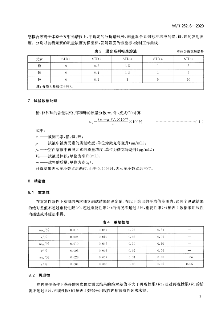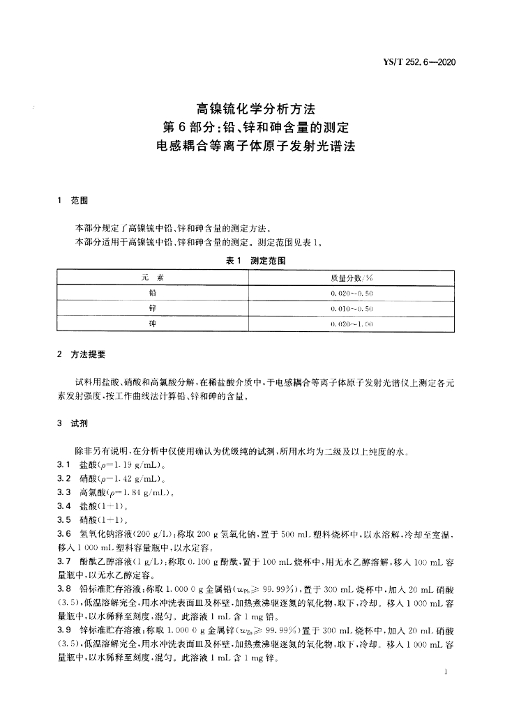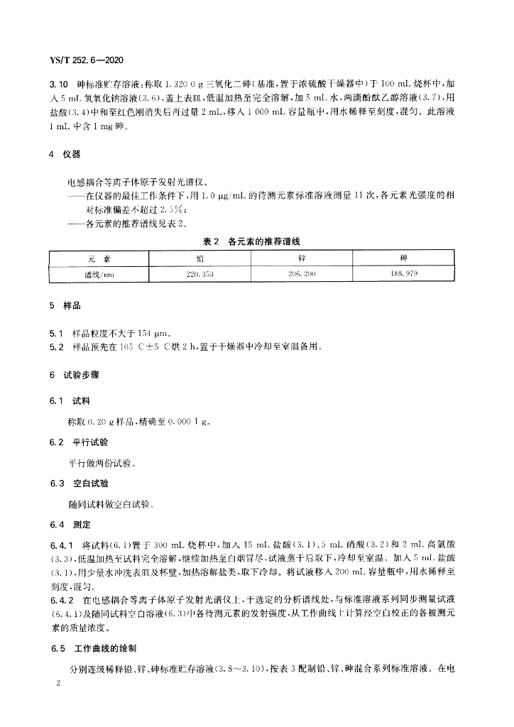 YS/T 252.6-2020 高镍锍化学分析方法 第6部分:铅、锌和砷含量的测定 电感耦合等离子体原子发射光谱法