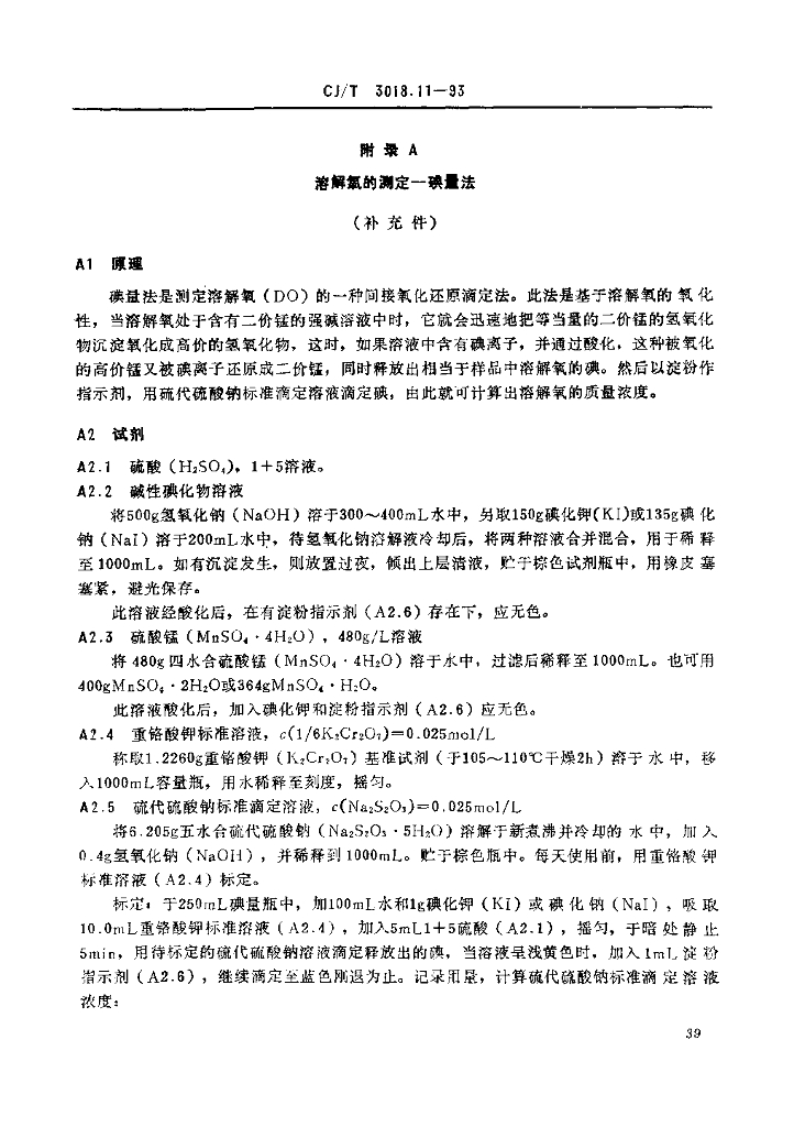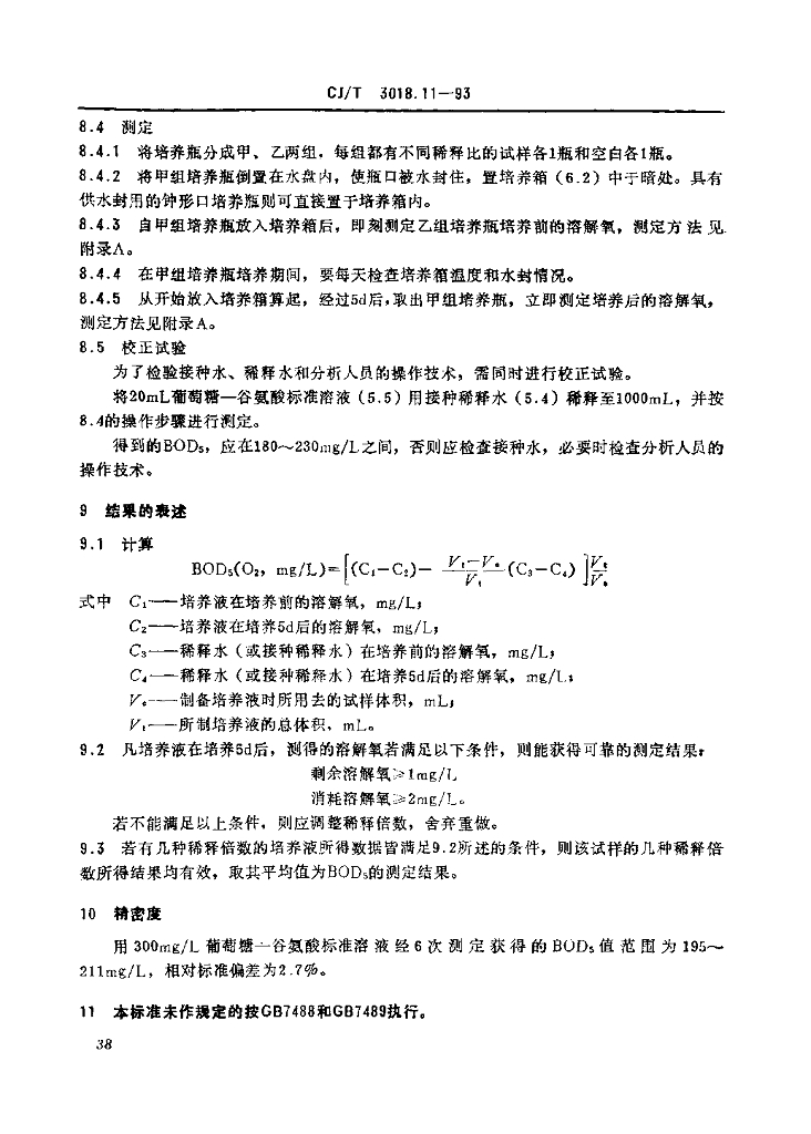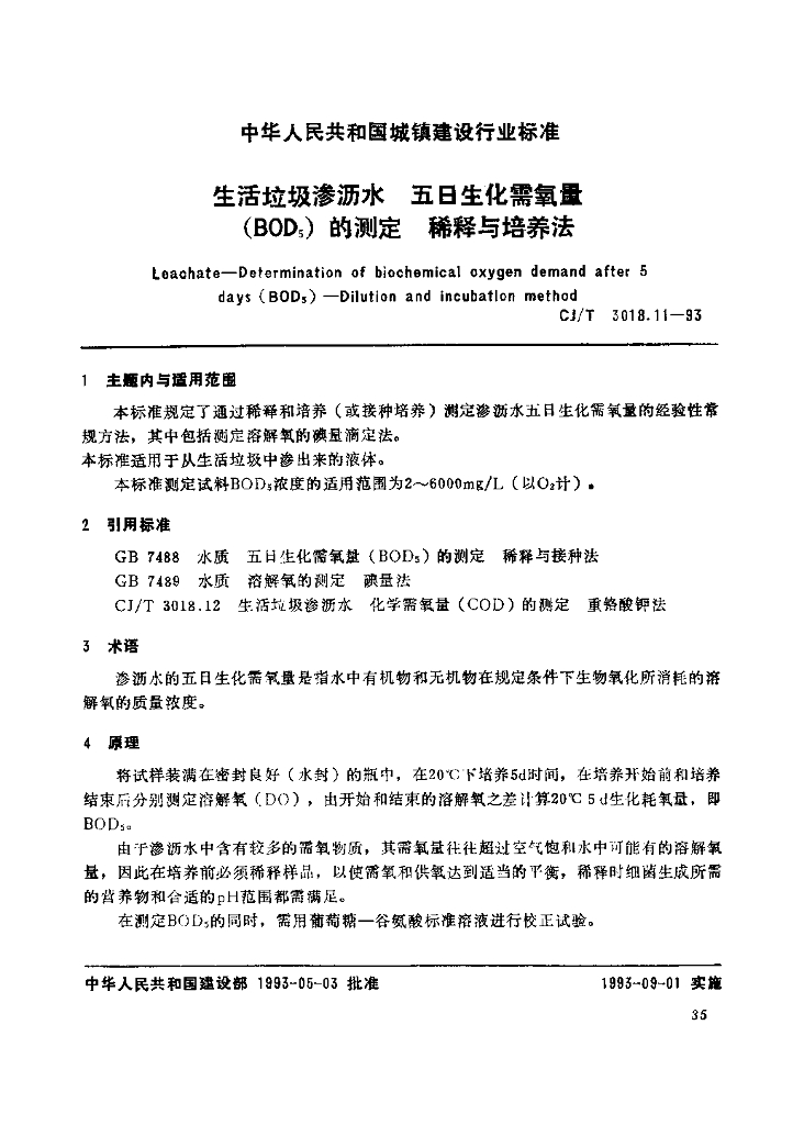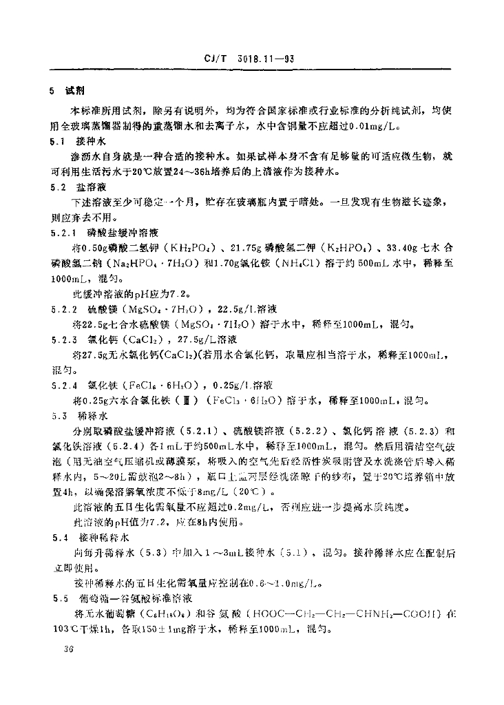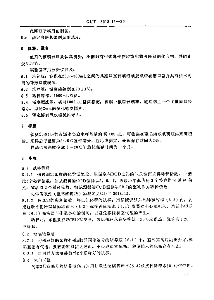 CJ/T 3018.11-1993 生活垃圾渗沥水 五日生化需氧量(BOD5)的测定 稀释与培养法