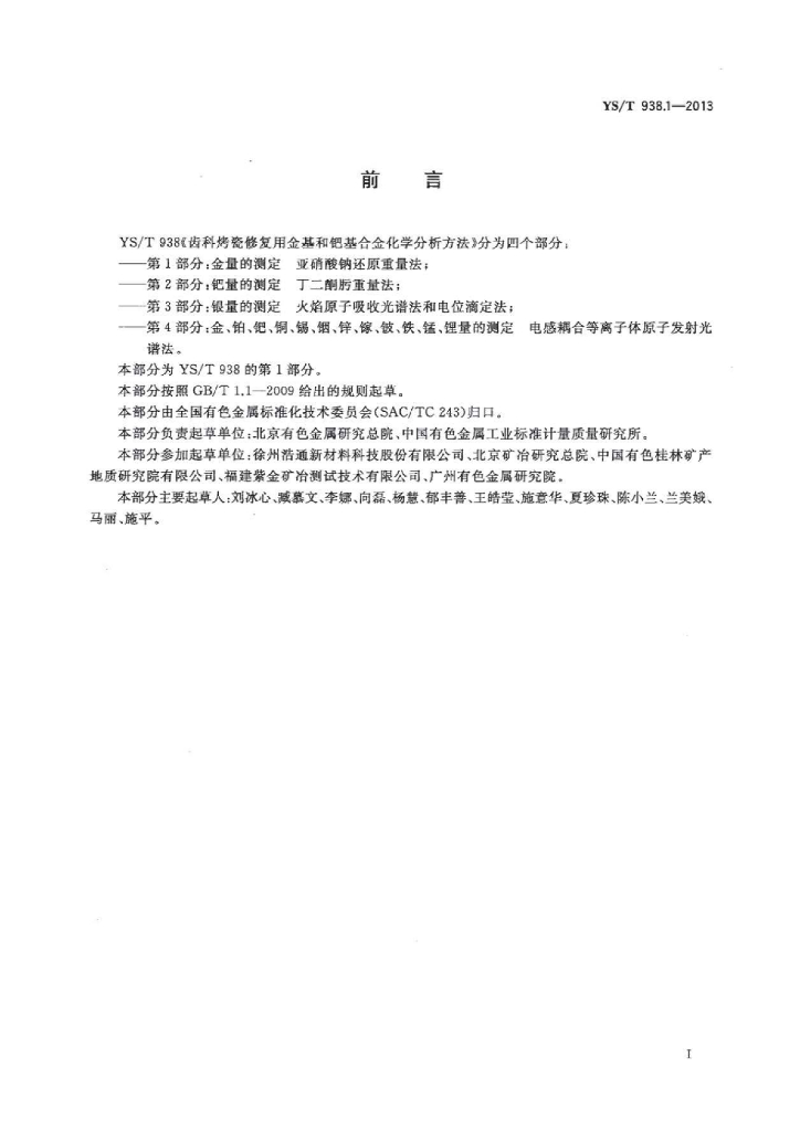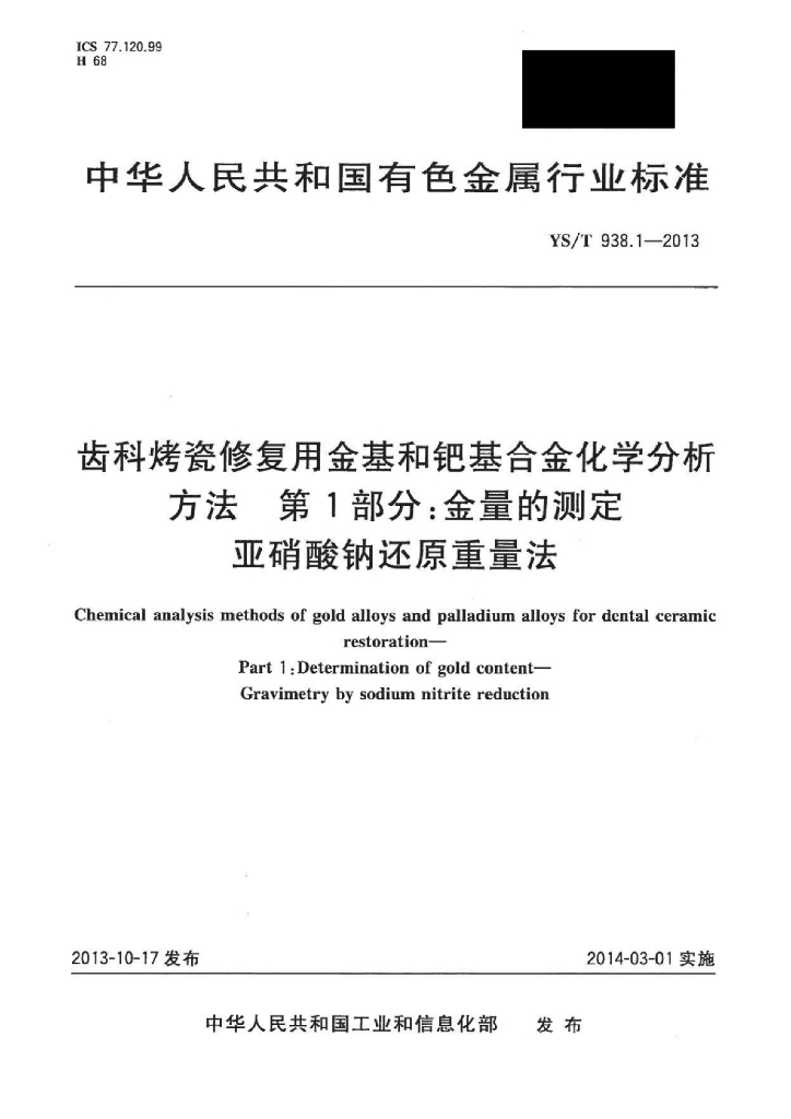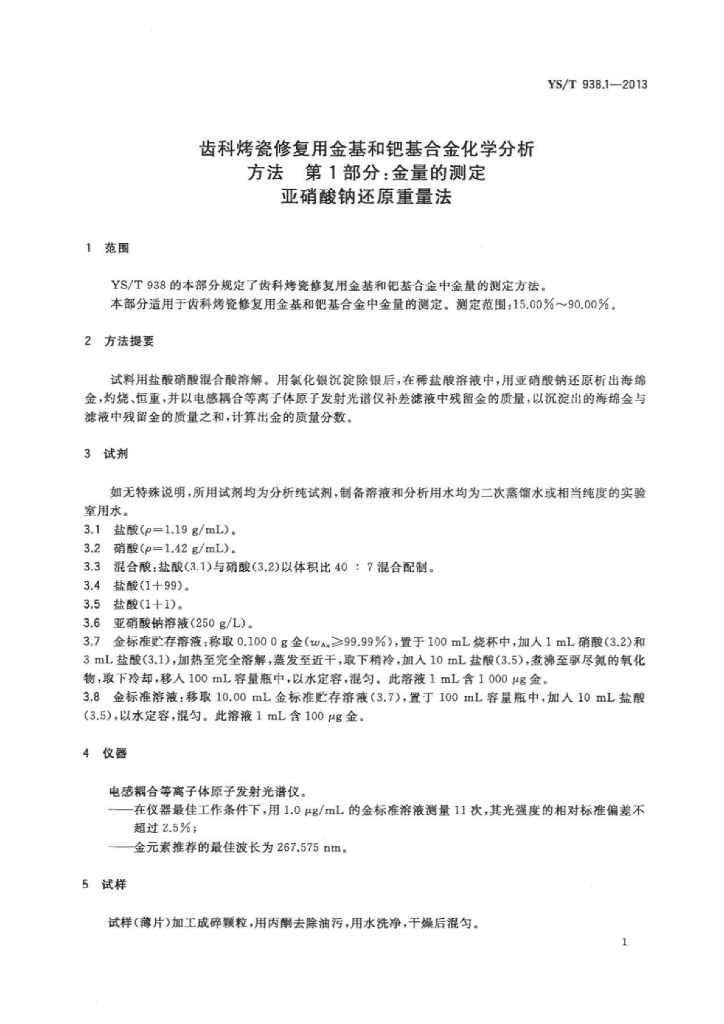 YS/T 938.1-2013 齿科烤瓷修复用金基和钯基合金化学分析方法 第1部分:金量的测定亚硝酸钠还原重量法