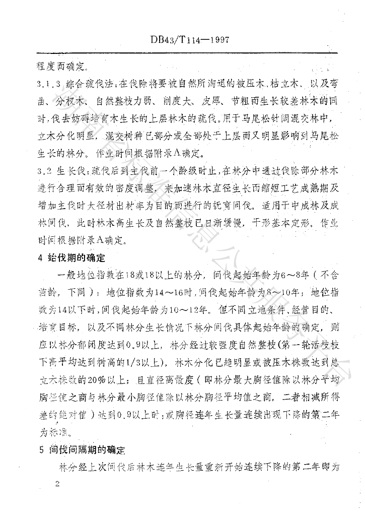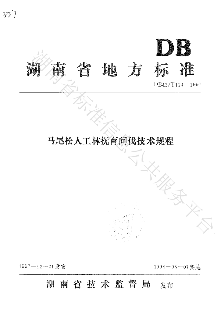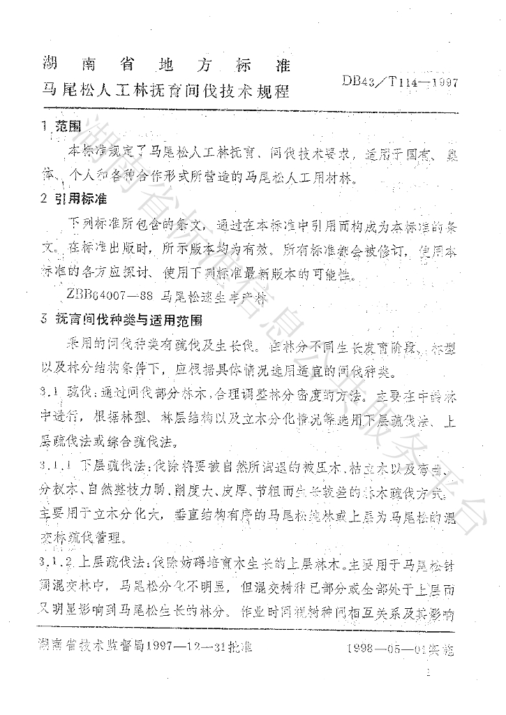 DB43/T 114-1997 马尾松人工林抚育间伐技术规程