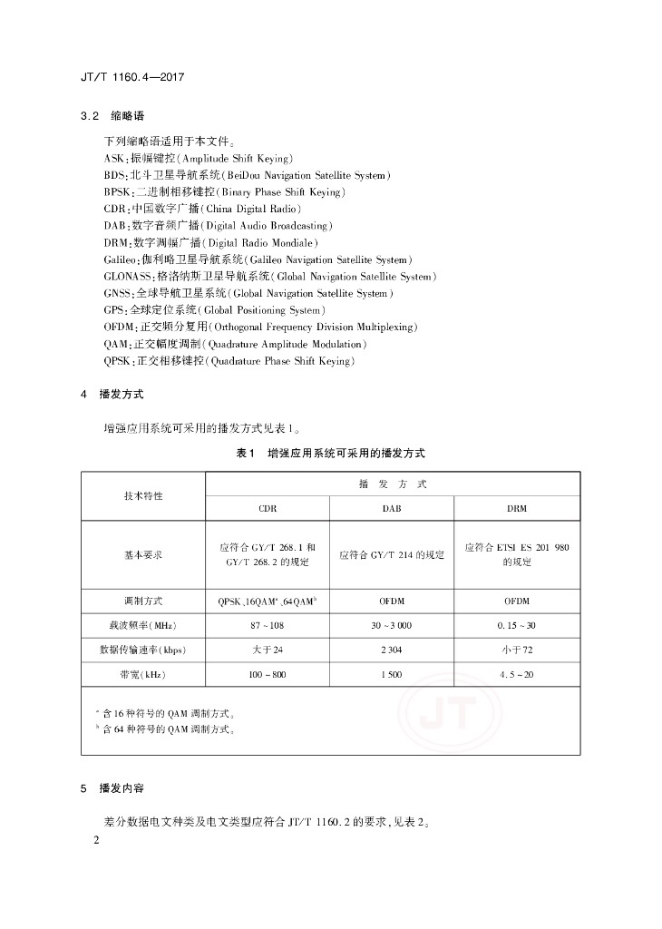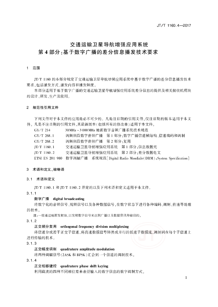 JT/T 1160.4-2017 交通运输卫星导航增强应用系统 第4部分:基于数字广播的差分信息播发技术要求