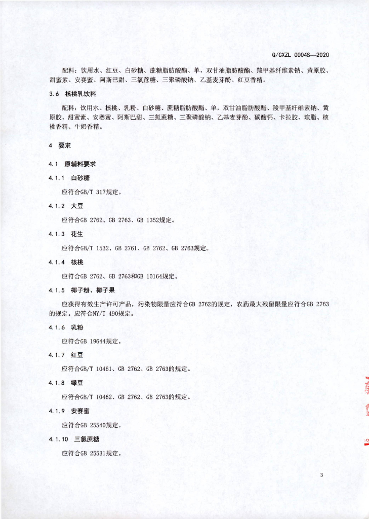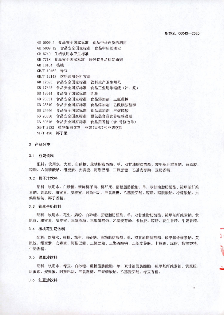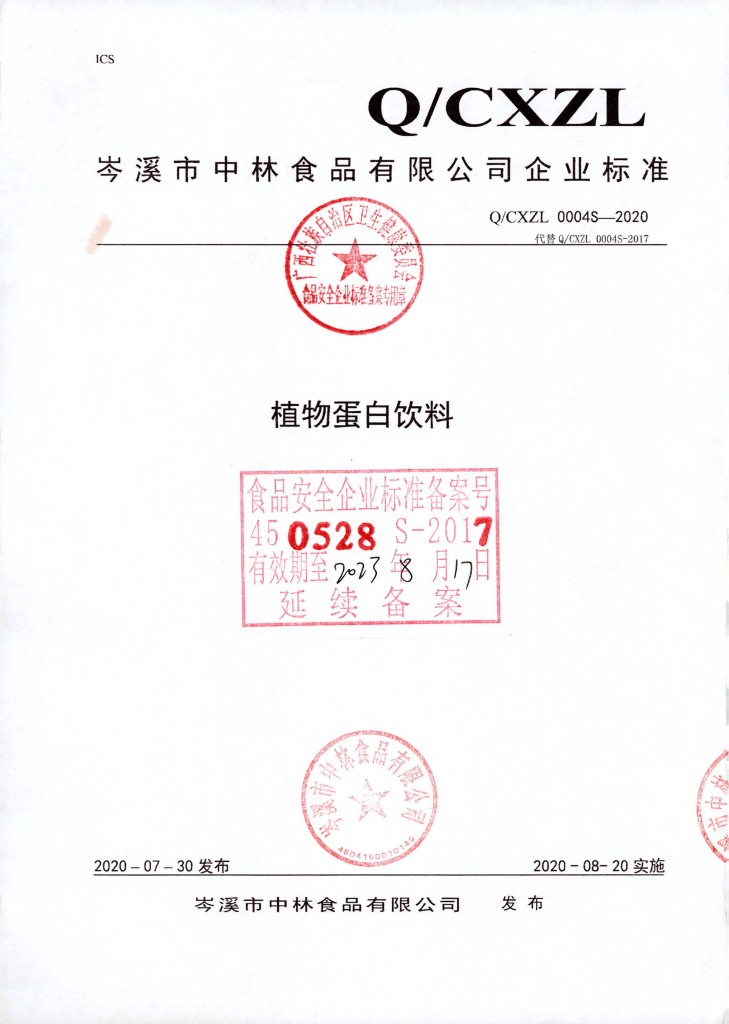 Q/CXZL 0004S-2020 植物蛋白饮料