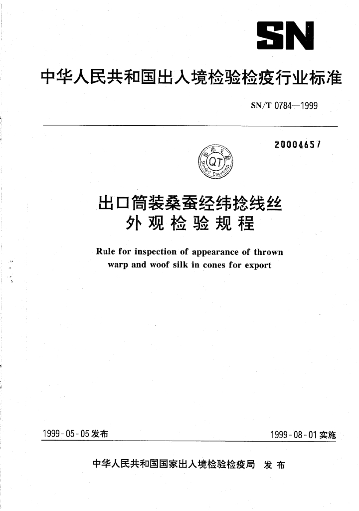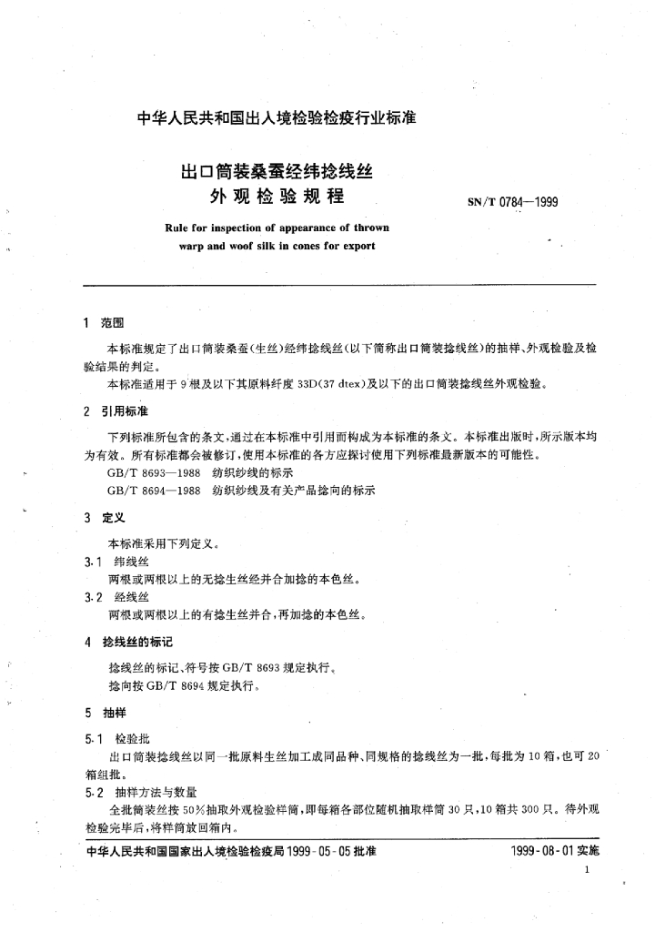 SN/T 0784-1999 出口筒装桑蚕经纬捻线丝外观检验规程