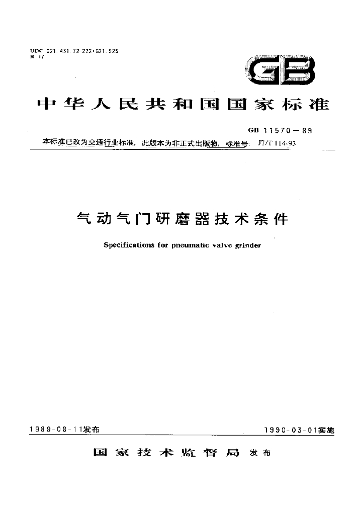 JT/T 114-1993 气动气门研磨器技术条件
