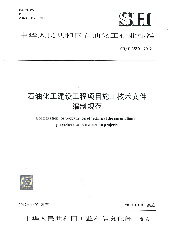 SH/T 3550-2012 石油化工建设工程项目施工技术文件编制规范