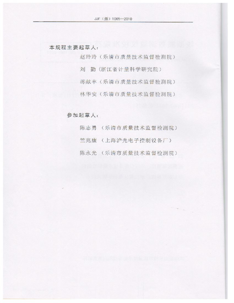 赵玲玲(乐清市质量技术监督检测院)、刘勤(浙江省计量科学研究院)、蒋献丰(乐清市质量技术监督检测院)、林华安(乐清市质量技术监督检测院)、陈志勇(乐清市质量技术监督检测院)、竺兆康(上海沪光电子控制设备厂)、陈永光(乐清市质量技术监督检测院)