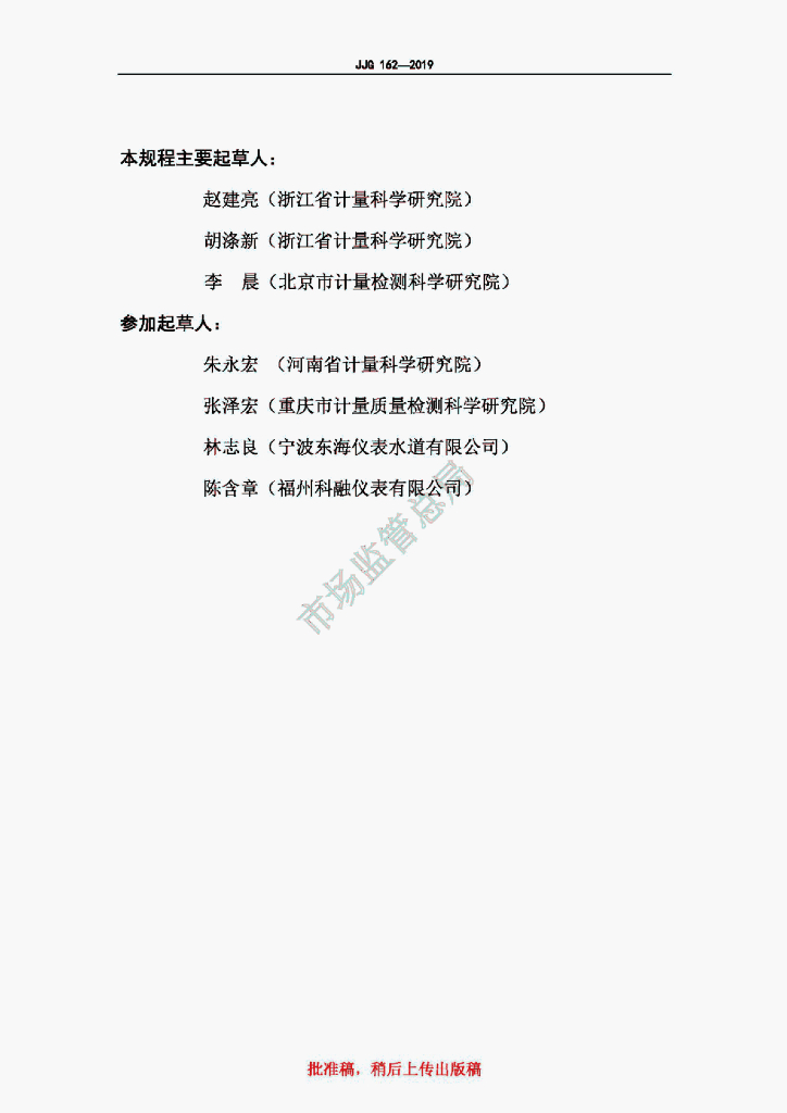 赵建亮(浙江省计量科学研究院)、胡涤新(浙江省计量科学研究院)、李晨(北京市计量检测科学研究院)、朱永宏(河南省计量科学研究院)、张泽宏(重庆市计量质量检测科学研究院)、林志良(宁波东海仪表水道有限公司)、陈含章(福州科融仪表有限公司)