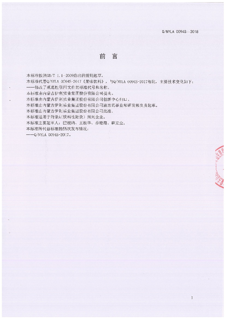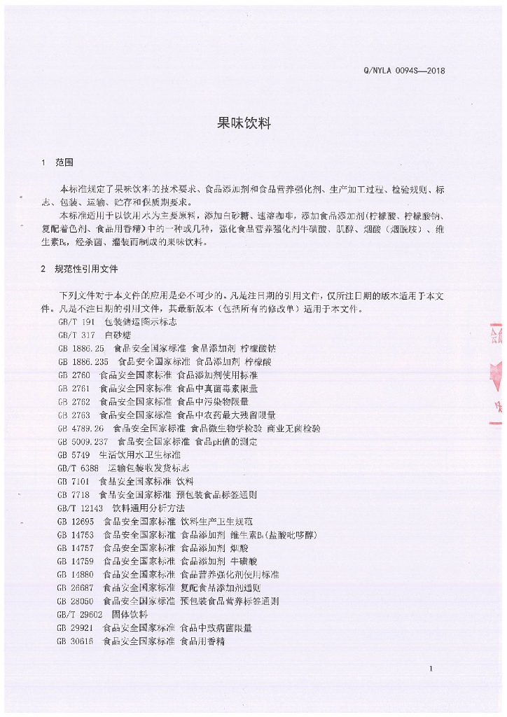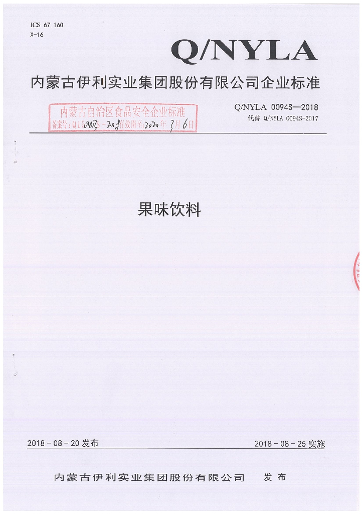Q/NYLA 0094S-2018 果味饮料