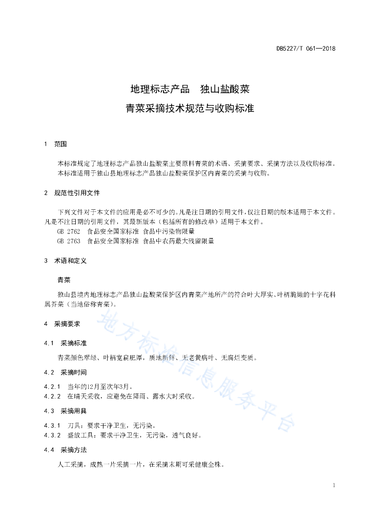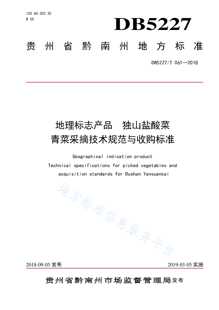 DB5227/T 061-2018 地理标志产品 独山盐酸菜青菜采摘技术规范与收购标准