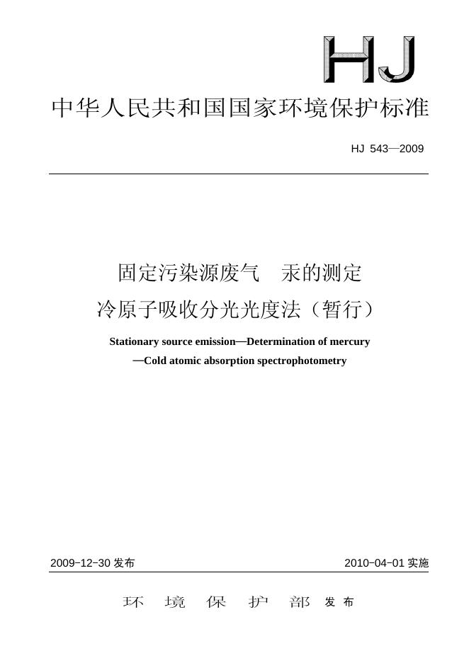 HJ 543-2009 固定污染源废气 汞的测定 冷原子吸收分光光度法(暂行)
