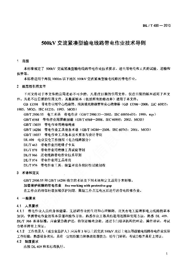 DL/T 400-2010 500kV交流紧凑型输电线路带电作业技术导则