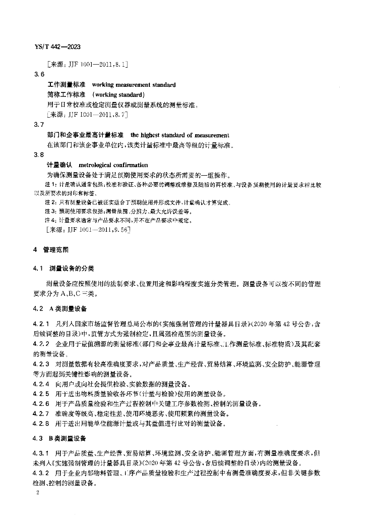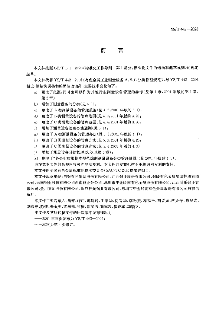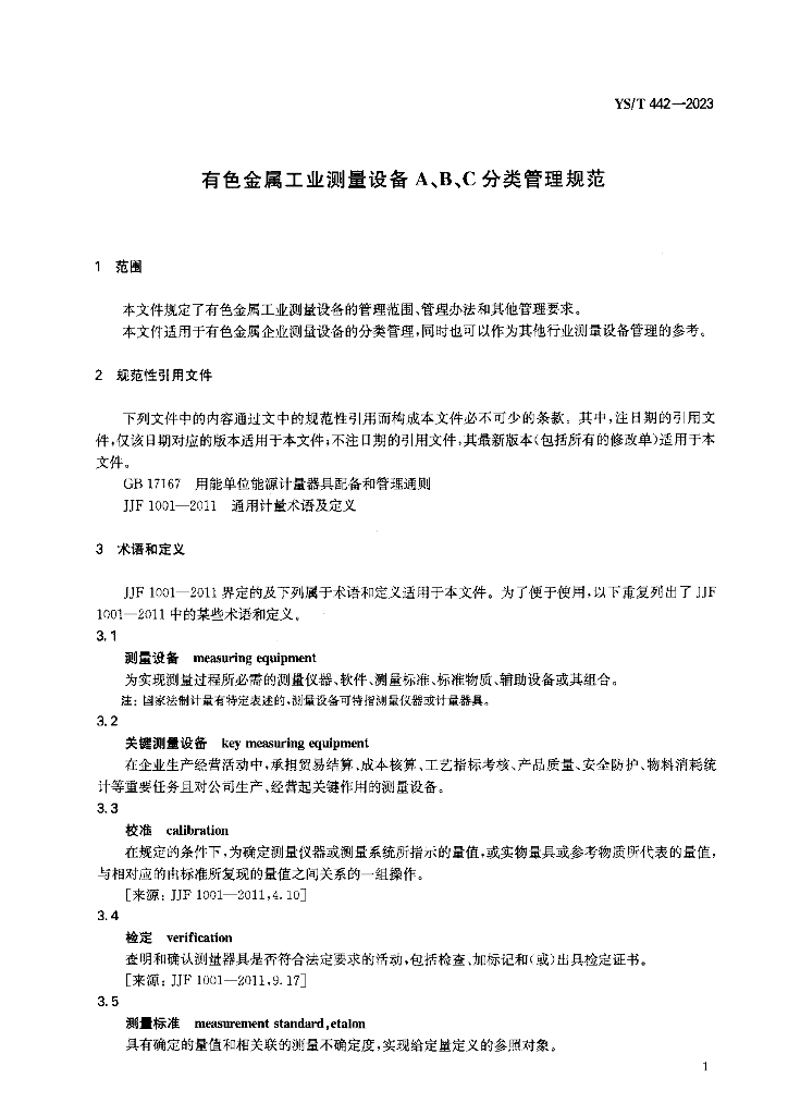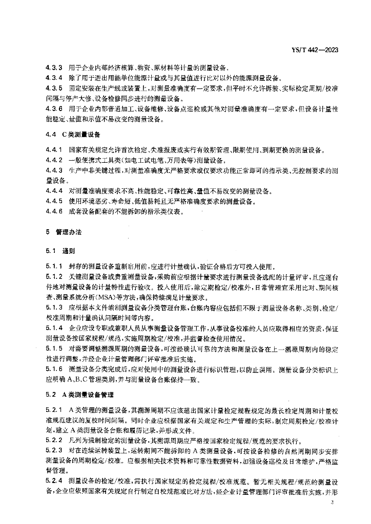 YS/T 442-2023 有色金属工业测量设备A、B、C分类管理规范