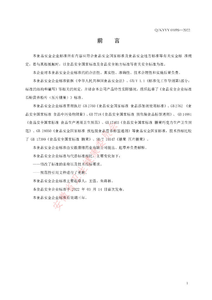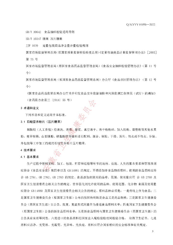Q/KYYY 0109S-2022 石蛙营养粉片(压片糖果)